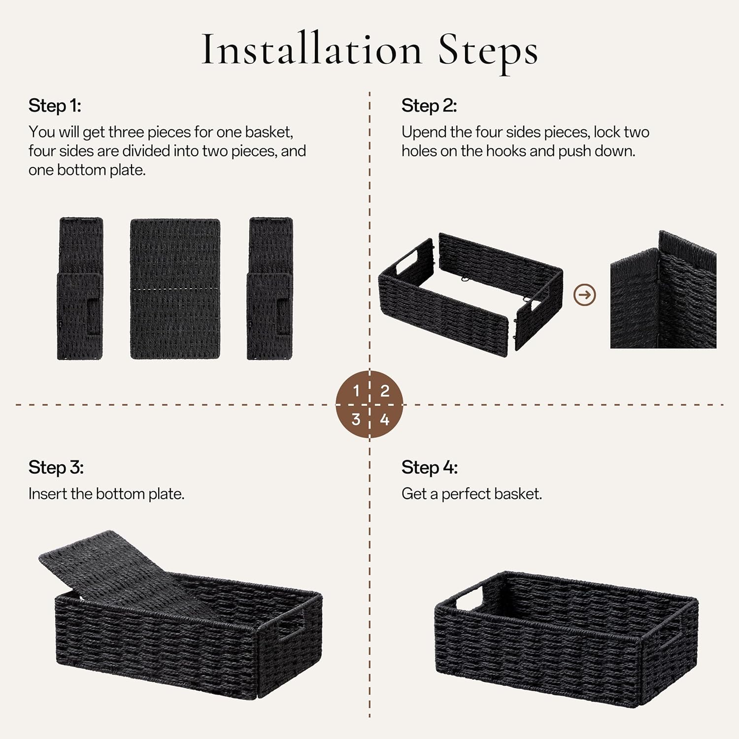 - Easy to assemble:When you receive the package, the wicker storage basket is folded, you should install it according to instructions, you will get a perfect wicker basket. You can fold them completely flat and stack them up against each other to save space when not in use.