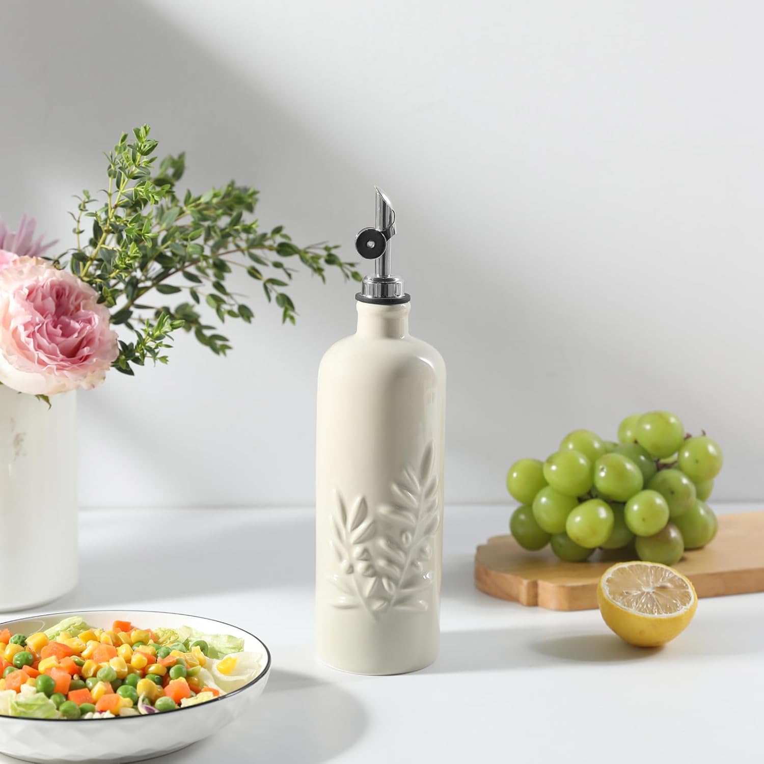 - Elegant Olive Leaf Relief Design-Featuring a beautifully crafted olive leaf, this ceramic oil dispenser adds a touch of charm to your modern kitchen. Its opaque finish and sleek spout complement any décor.