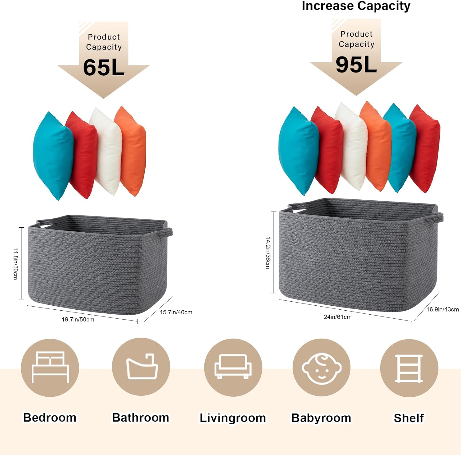 65L Large Storage Basket, Cotton Rope Woven Blanket Basket, Toy Storage for Baby Room, Living Room, Dark Grey
