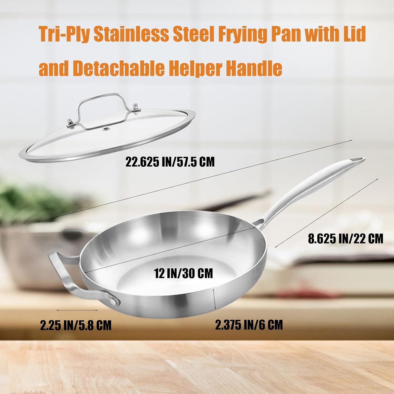 Inqibee 12 Inch Tri-Ply Stainless Steel Frying Pan with Lid and Helper Handle,Skillet,Induction Cooking Pan,Dishwasher and Oven Safe,Detachable Handle.