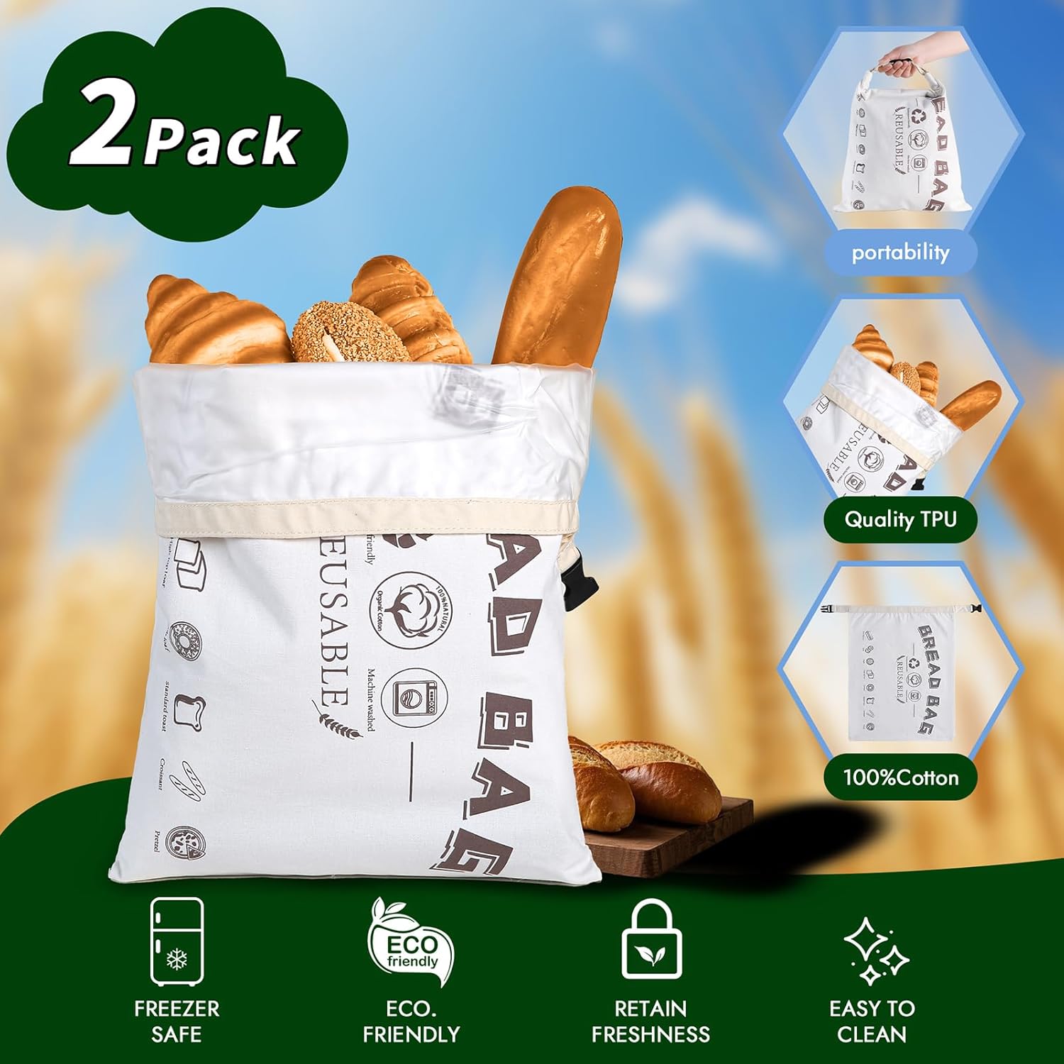 Reusable Bread Bags for Homemade Bread,Cotton Bags with Food Grade TPU Liner Extend Freshness, Large Capacity Cloth Bag for Travel Friendly,Washable,Refrigerable, Gift for Bakers (Set of 2)