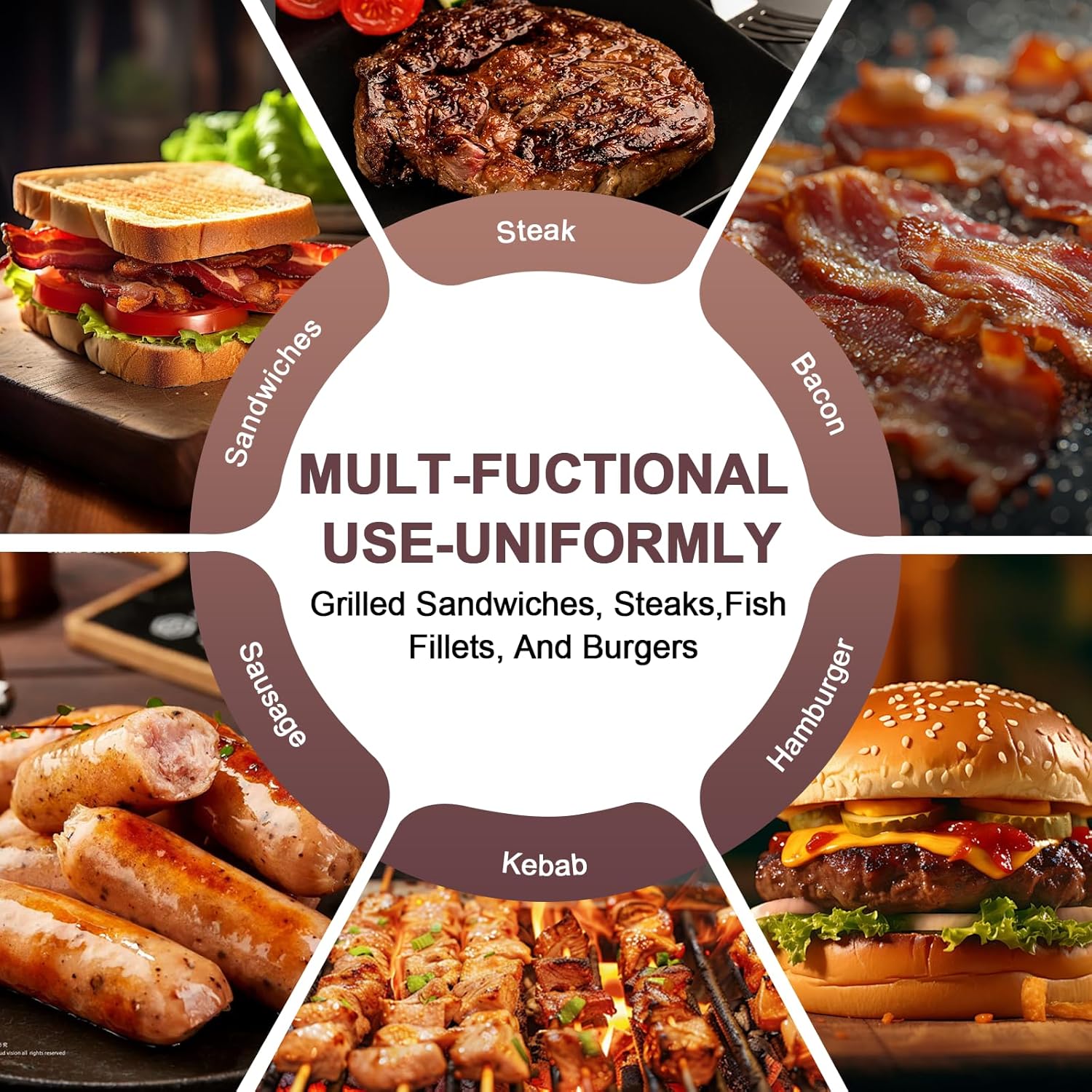 - Premium Stainless Steel Construction: Food-grade 2.5mm thick stainless steel outperforms traditional cast iron grill press,Non-porous surface prevents sticking (easier maintenance than cast iron burger press), 2.6lb optimized weight for perfect searing without crushing food