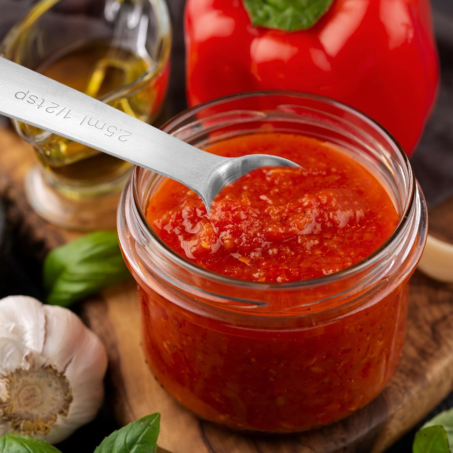 - 【Thoughtful design】Our 1/2 tsp measuring spoon is thoughtfully designed, combining the essence of the cup-shaped round head design and the long handle design. This allows the small measuring spoons to easily penetrate into spice jars and other small containers, effectively overcoming the problem of spice spillage and spoon storage, bringing you an unprecedented convenient experience