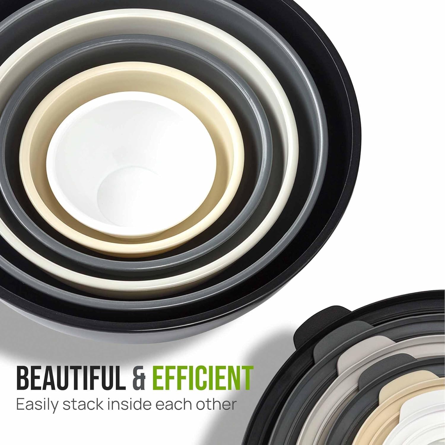 - STACKABLE, EASY TO CLEAN DESIGN: These nesting mixing bowls for kitchen can be stacked on top of each other to save space. The plastic bowls with lids are top-rack dishwasher friendly and can also be hand washed with soap and water (avoid the use of abrasive sponges).