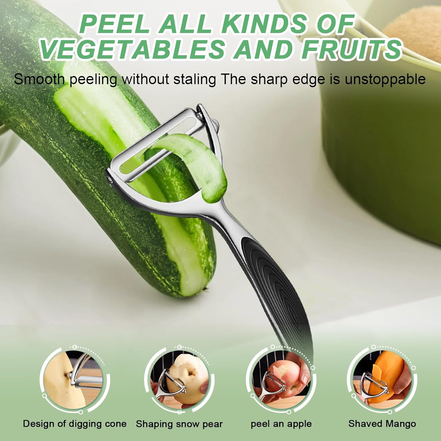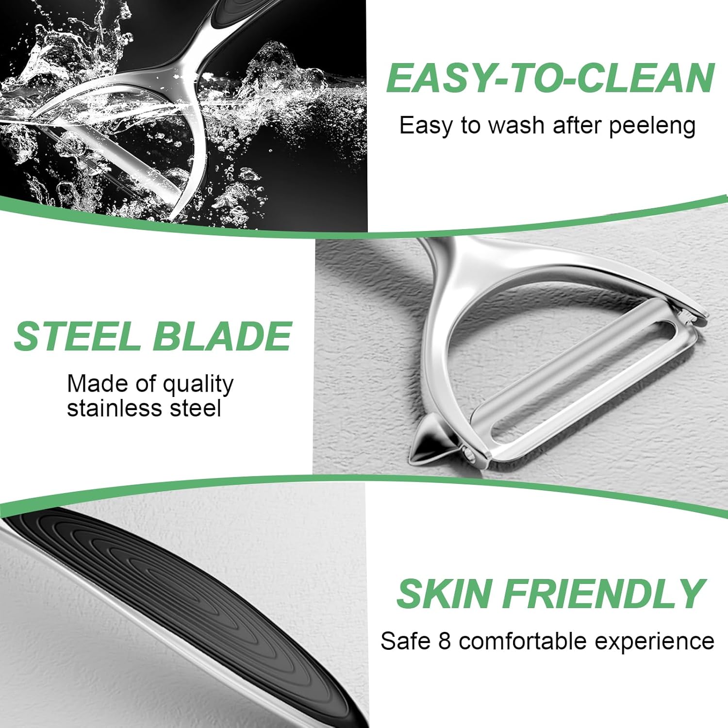 - Effortlessly peel even tough skins with razor-sharp stainless steel blades! Perfect for potatoes, carrots, apples,tomatoes and rest veggie . The Y-shape tackles flat surfaces, while the I-shape glides through curves β no wasted flesh, just smooth peeling every time.