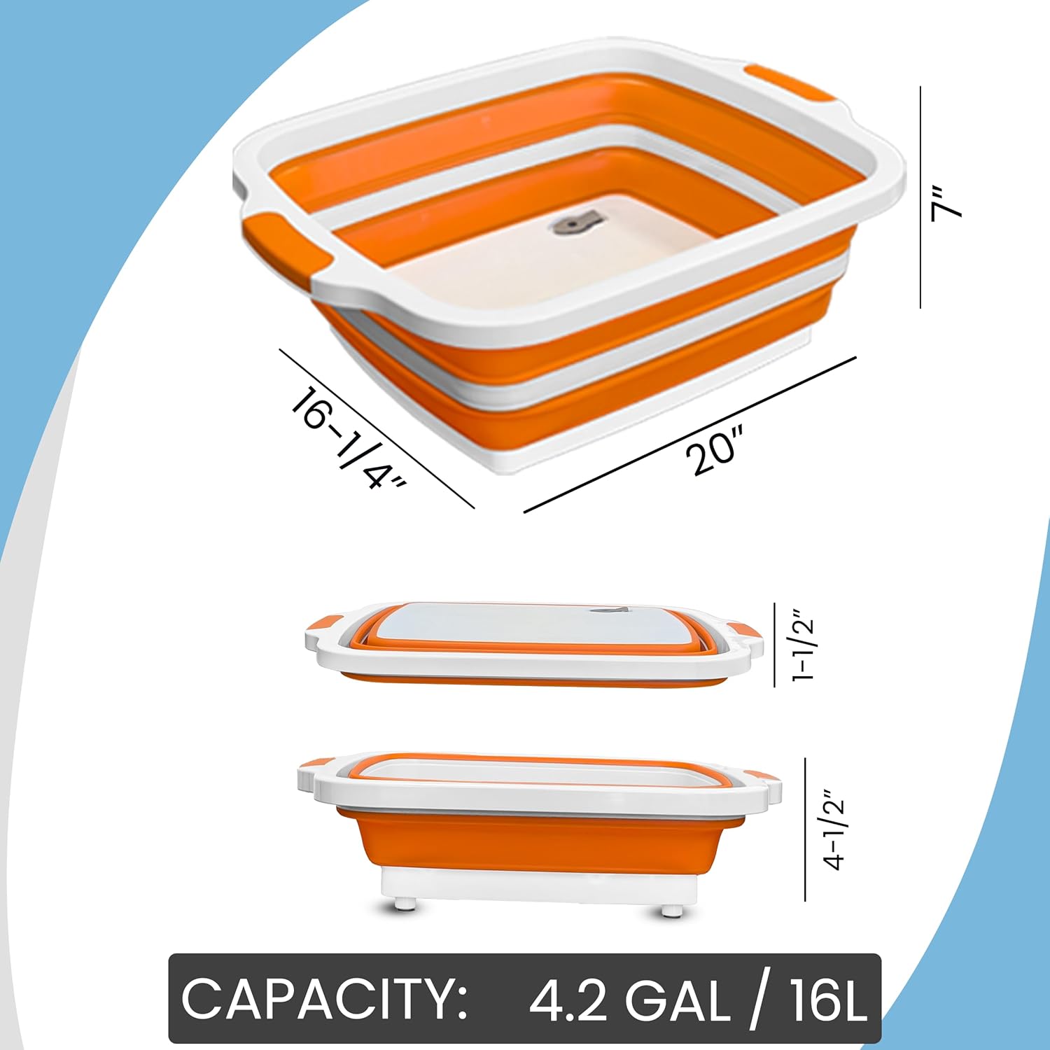 - FOLDABLE AND SPACE SAVING: Collapsible dish tub or bbq meal prep tub is easy to collapse down and store under the sink or cabinet, saving up to 80% storage space. Our collapsible marinating tub with lid is great space saver kitchen gadgets for small kitchen, RV, travel trailer, camper, caravan, and any limited rooms. Our versatile collapsible water container is designed for seamless meal preparation, serving, and storage, with cutting board and locking lids to keep your ingredients fresh and countertops clean. You can Save space with our collapsible tub.