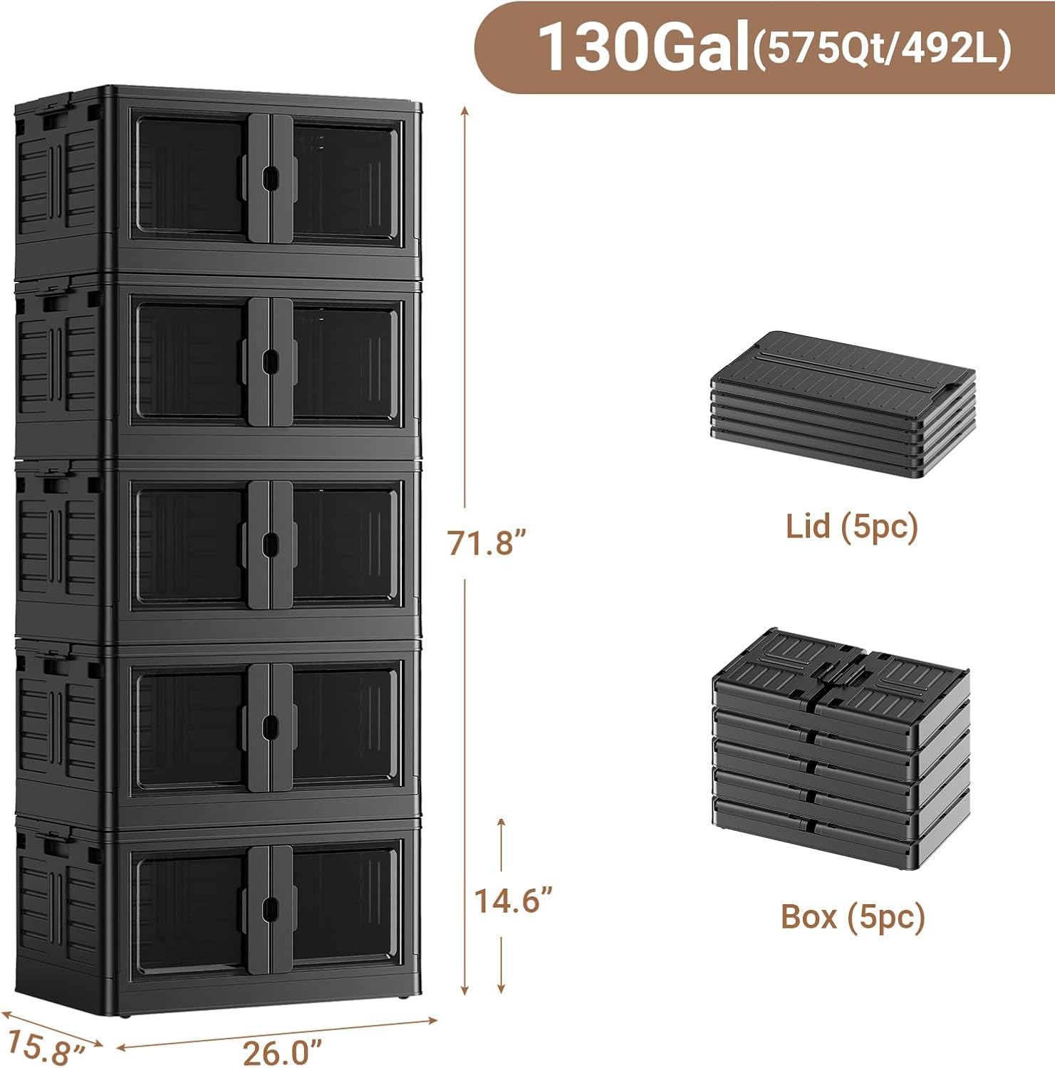 575Qt Stackable Storage Bins with Individual Lids & Wheels, Large Plastic Collapsible Latching Boxes Closet Organizers and Storage Cabinet Shelves Units for Home Kitchen Dorm, 5-Pack Black