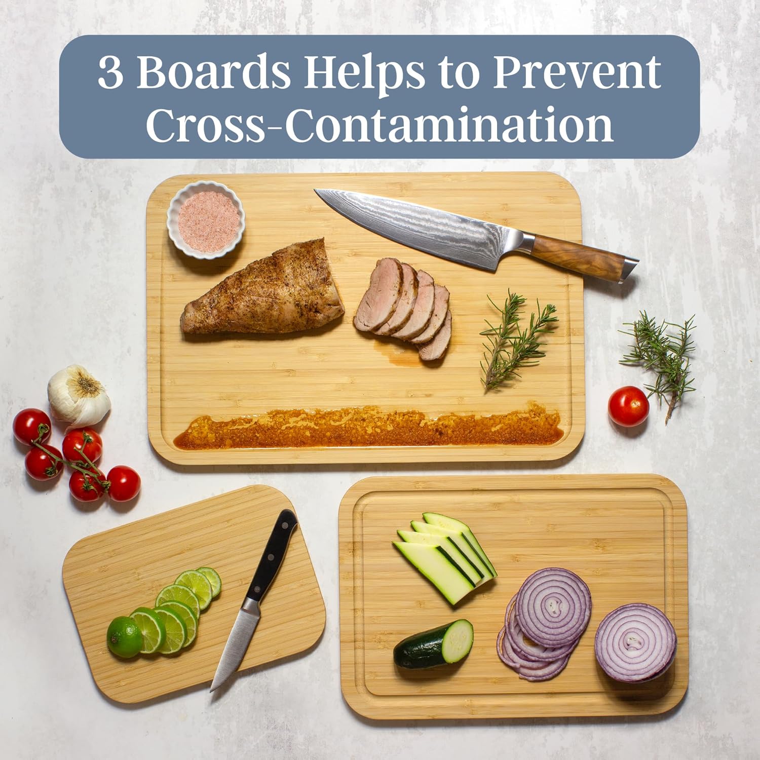 - Thoughtfully Designed for Precision Prep – This three-board set includes a large carving board with a collection well, a medium board with a juice groove, and a small board ideal for garnishes, herbs, and fine slicing
