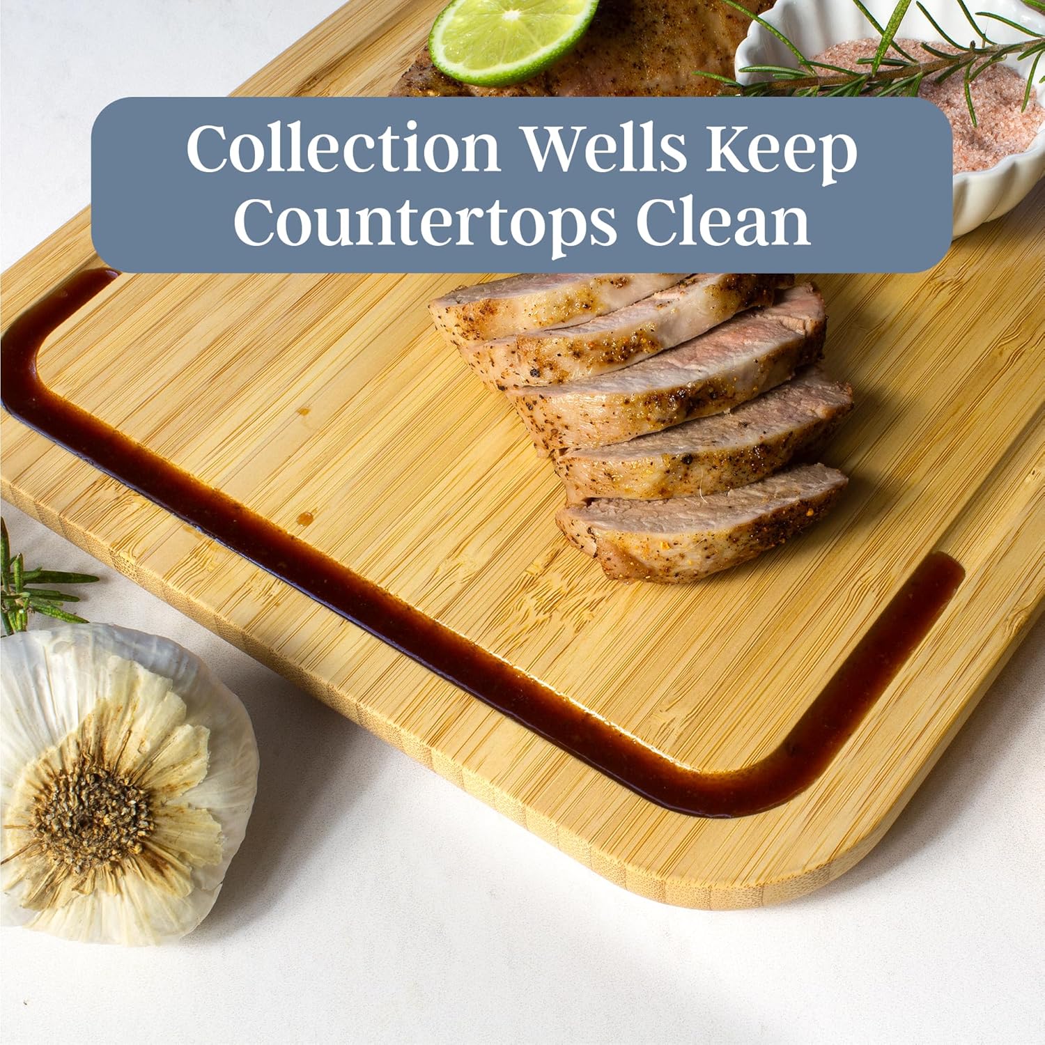 - Keeps Counters Clean – Built-in juice groove on the medium cutting board and collection well on the large carving board help contain messes and liquids during food prep