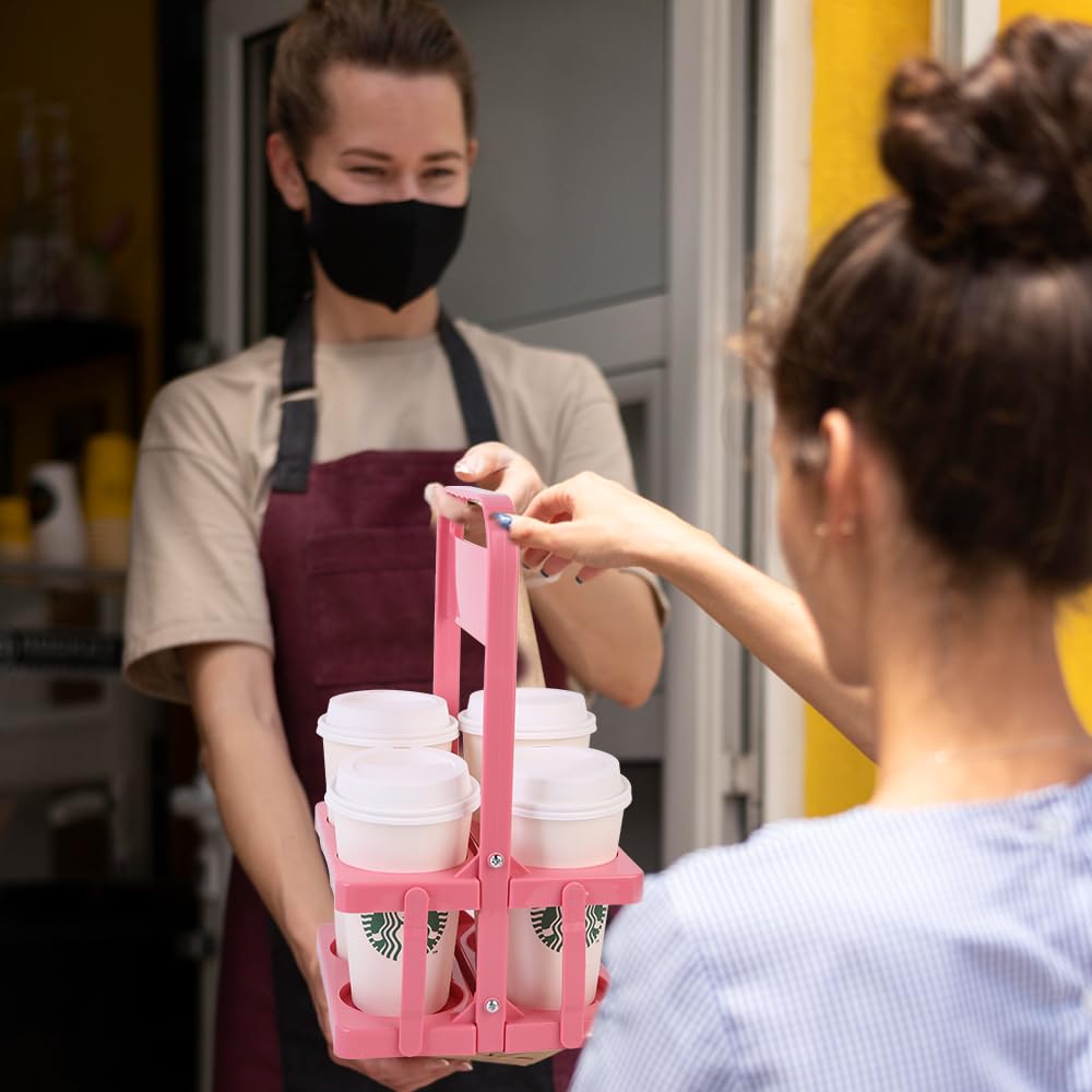 Bodaon 4 Cup Drink Carrier with Handle, Plastic Cup Carriers for Drinks, Drink Holder for Car, GrubHub/Eats Doordash Accessories, Portable Foldable Reusable Mobile, Use for Food Delivery Bag, Pink