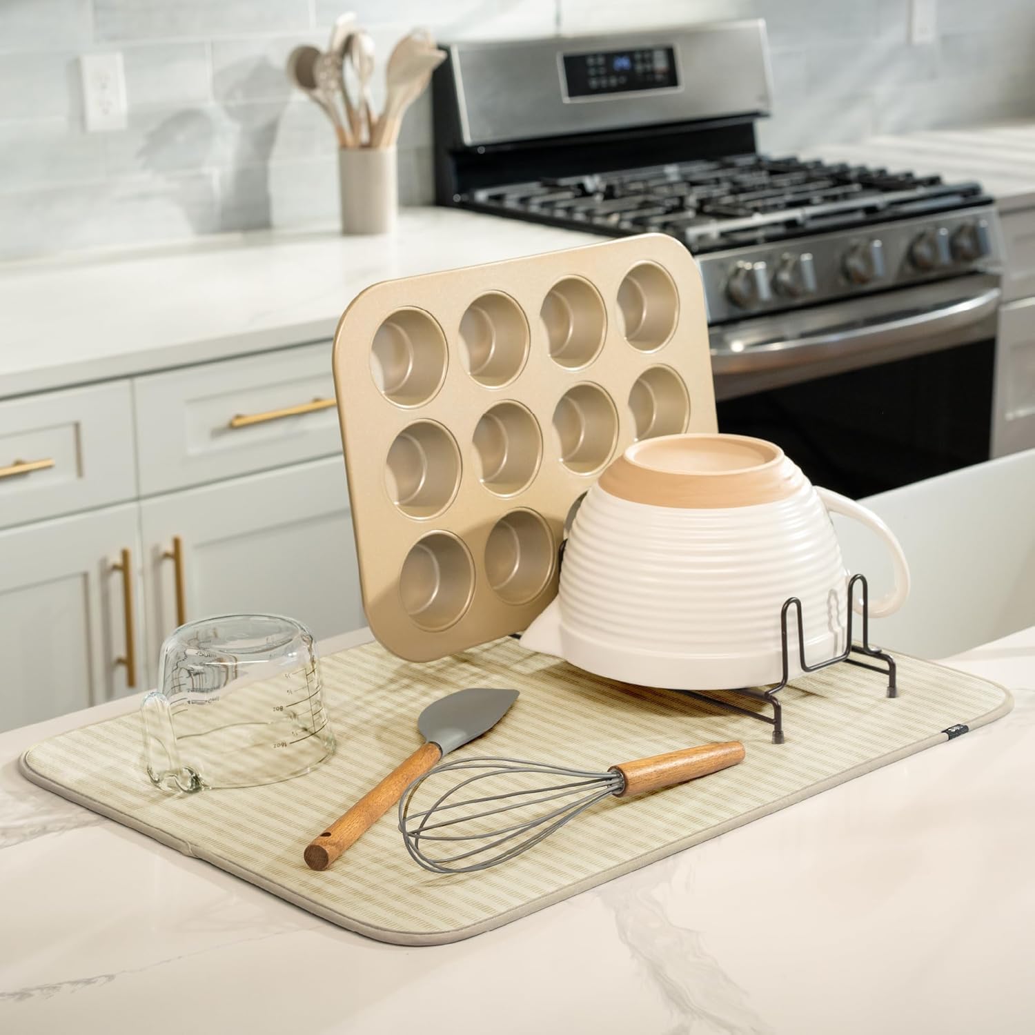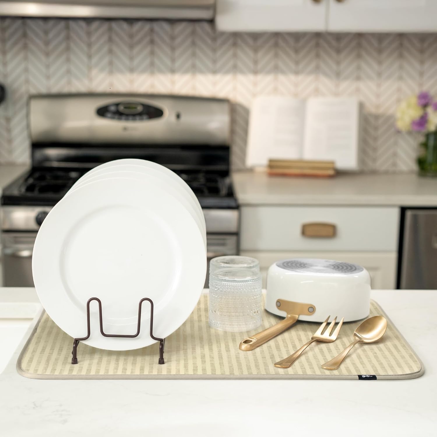 S&T INC. Dish Drying Mat XL, 18” x 24”, Absorbent Microfiber Kitchen Counter Mat, Dish Drying Pad for Dishes, Utensils, Pots and Pans, Extra Large, Cream Distressed Lines