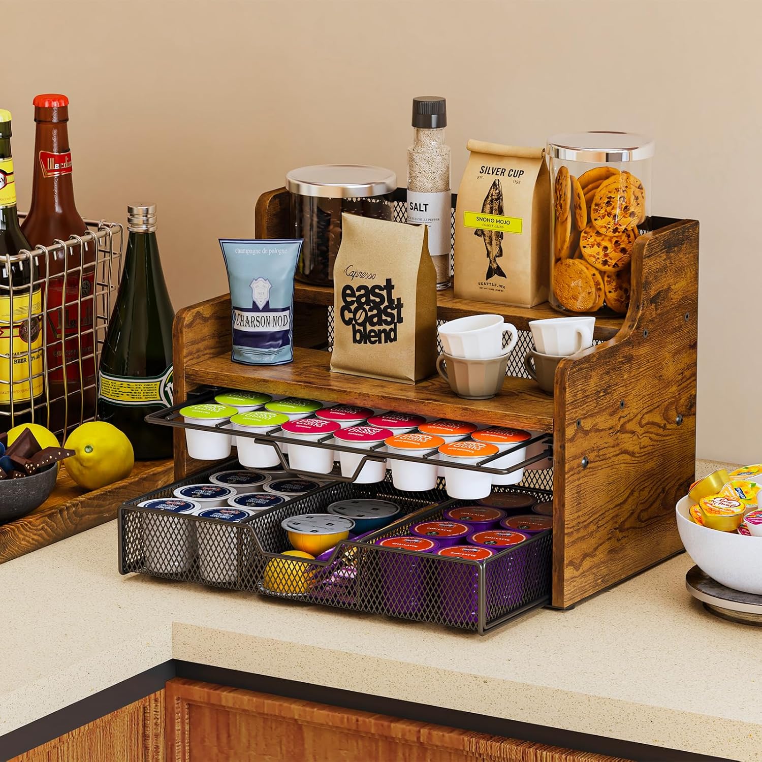 Coffee Pod Holder with Drawer & Dividers, 4-Tier Wood K Cup Organizer for Countertop, Coffee Bar Organizer Storage Box, Coffee Station Organizer for Kitchen Coffee Station