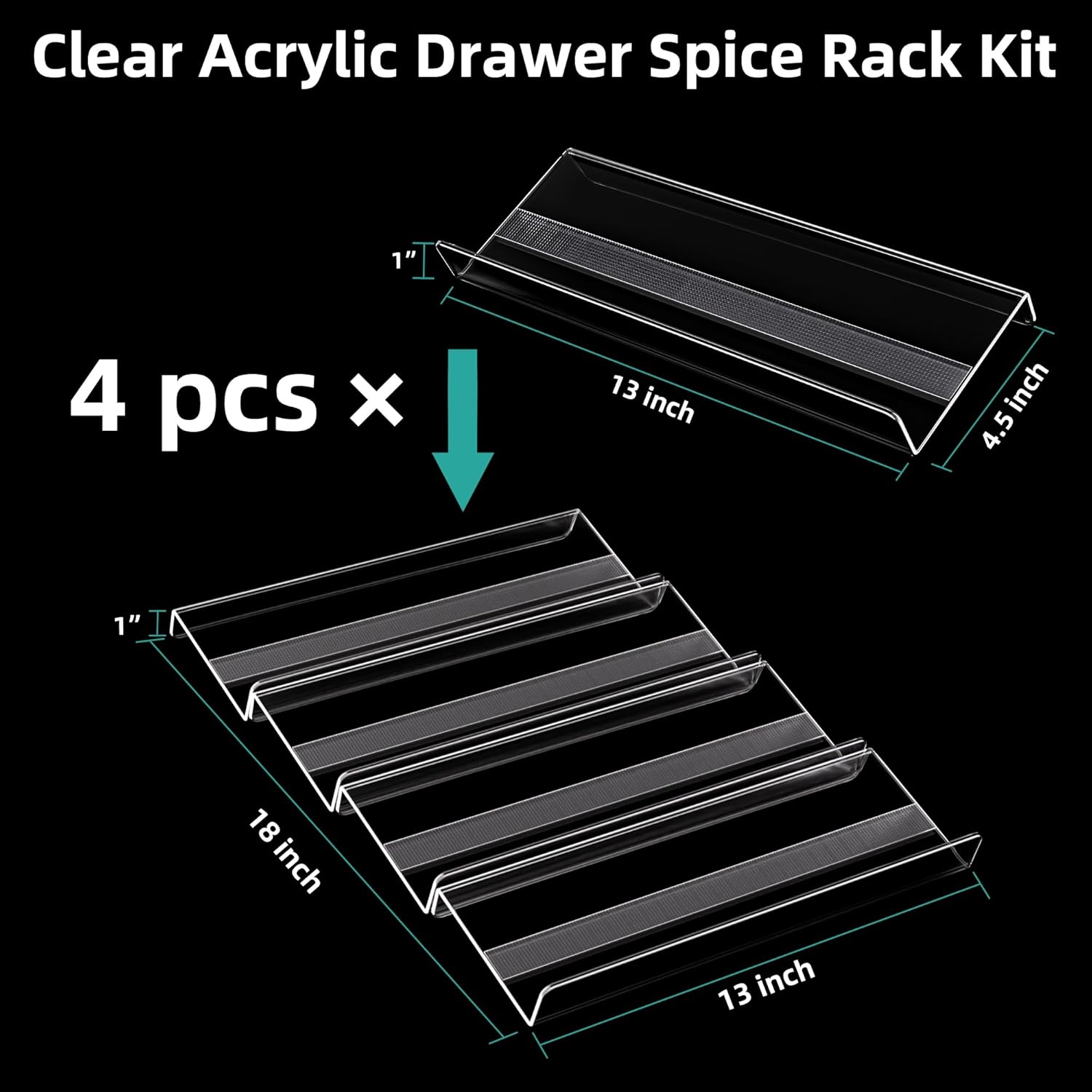 - 【Expandable Kitchen Drawer Spice Rack】4-piece 3mm Thick Spice Rack for drawer (each piece 13*4.5 inches) can be expanded from 13 inches to 26 inches to fit drawers, cabinets of different sizes.
