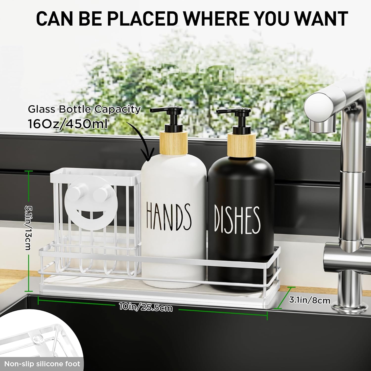 - 【WHAT WILL YOU GET?】Our luxury soap dispenser for kitchen sink comes with a quick drain tray, hand and dish soap dispenser set, a smiley sponge storage rack, and a high brush rack that can accommodate long brushes. A one-stop solution to your sink storage problem.