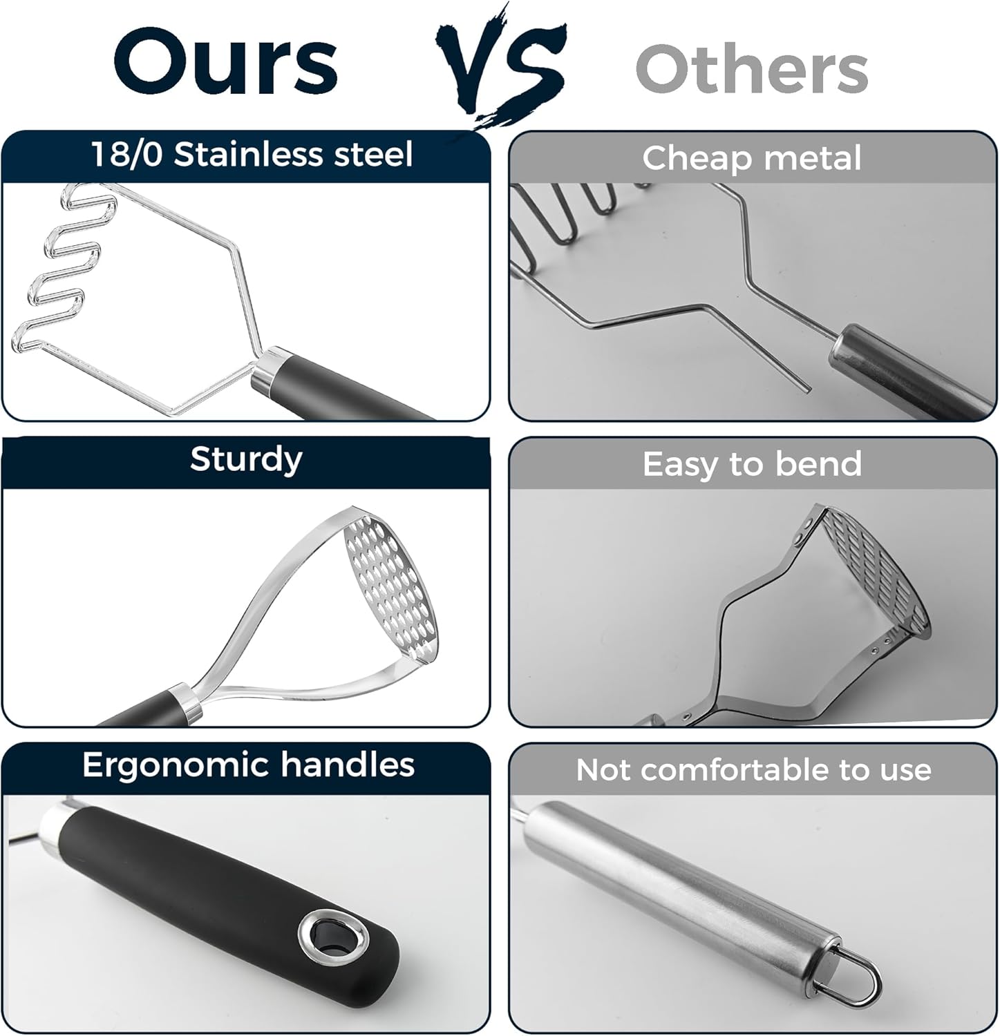 - Multifunctional: This masher set includes two different types of mashers for multiple mashing scenarios, including potatoes, avocado, vegetables, beans, nuts, fruits, squash, potatoes and more!