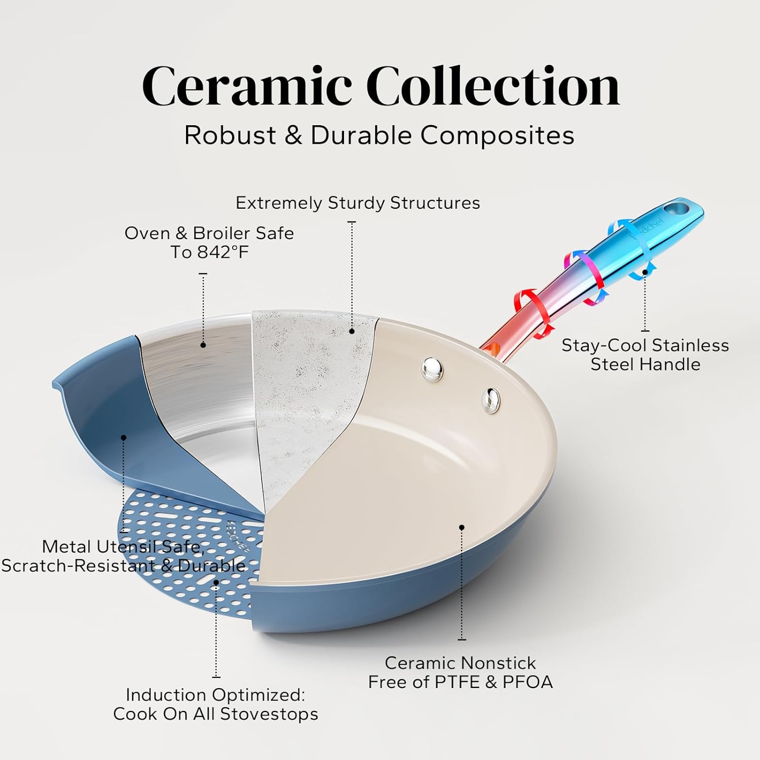 - COOL & STURDY HANDLE: Crafted from lightweight, precision-pressed stainless steel, this ergonomically designed handle ensures a comfortable grip. Double-riveted for exceptional strength and maneuverability, ceramic saute pan empowers you to seamlessly transition from stovetop to oven, allowing you to achieve that flawless sear, brown toppings, or even bake