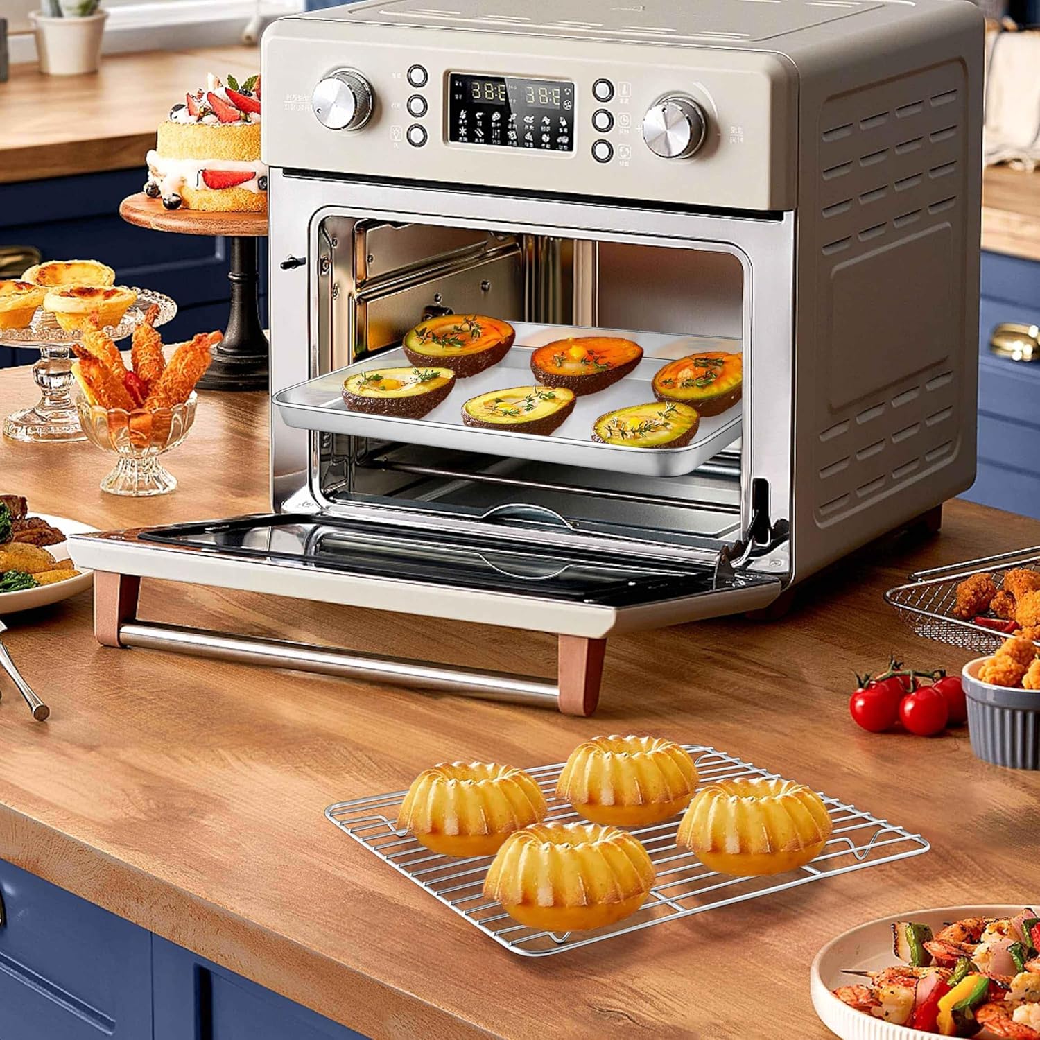 - Baking tray, nonstick bakeware set includes 1 cookie sheet pan 9.3" x 7" x 1" and 1 cooking rack 8.7" x 6.3", work perfectly together or shine in their respective fields, fits the most common oven, toaster oven and air fryer, big and deep to meet sweet or savory baking, ideal for toasting dinner as chicken, steak, serving vegetable, cookies and meats, make you enjoy your cooking baking journey