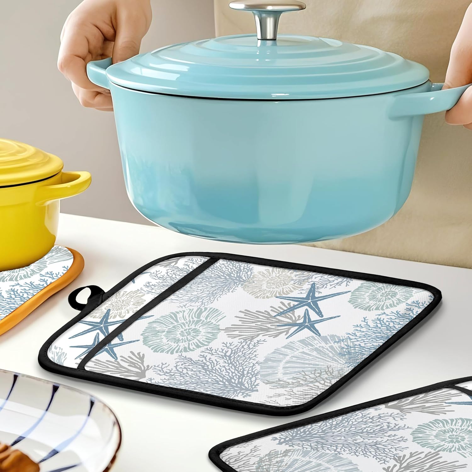 Coastal Beach Seashell Coral Starfish Oven Mitts Set, Ocean Beach Gifts for Women, Blue Heat Resistant Kitchen Oven Gloves for Baking and Cooking,Pot Holders
