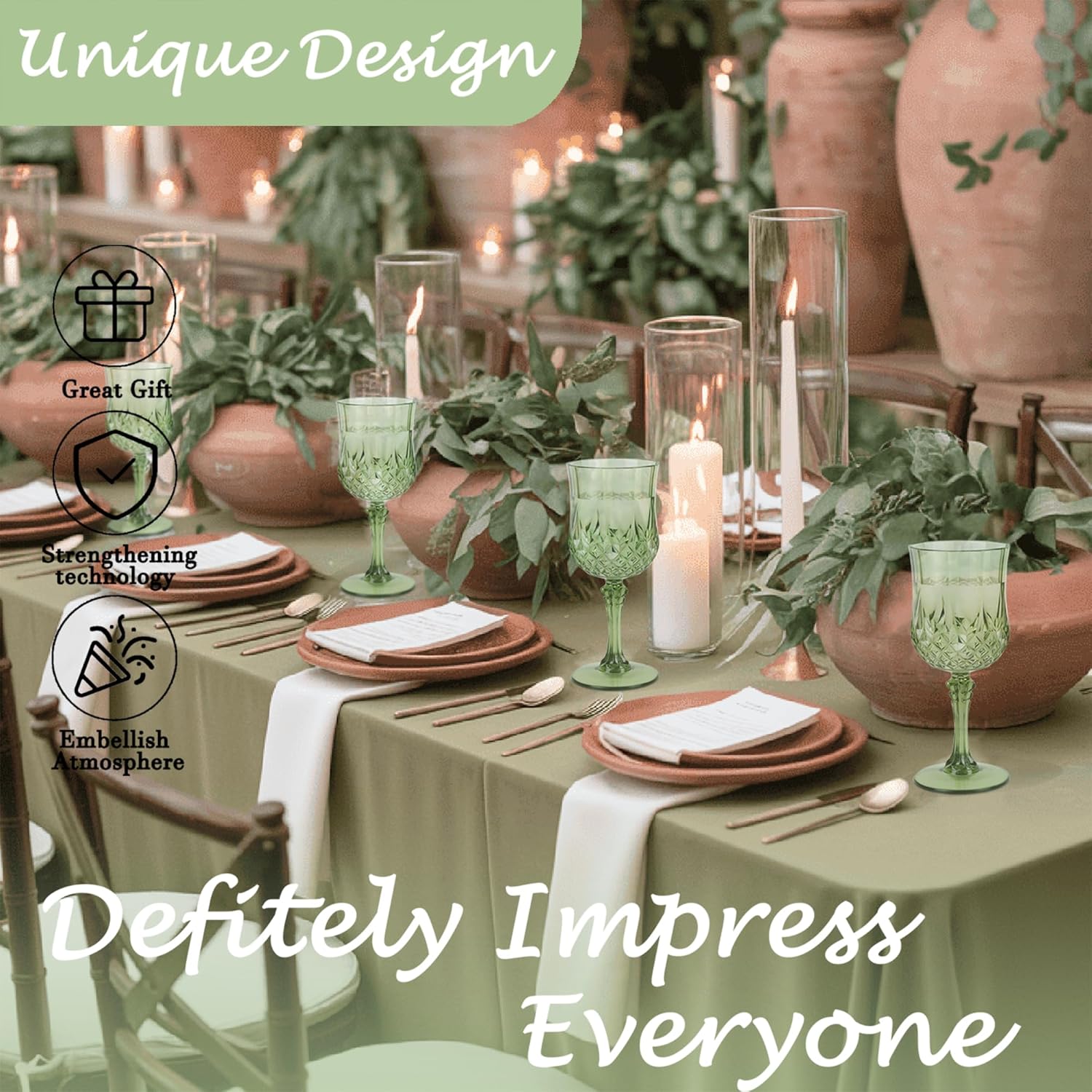 - 🍷🍷🍷【Product Description】 This set includes 12 retro-style light green party plastic wine glasses, providing ample quantity to meet your daily use and replacement needs. The elegant and sophisticated design makes your wedding reception unique