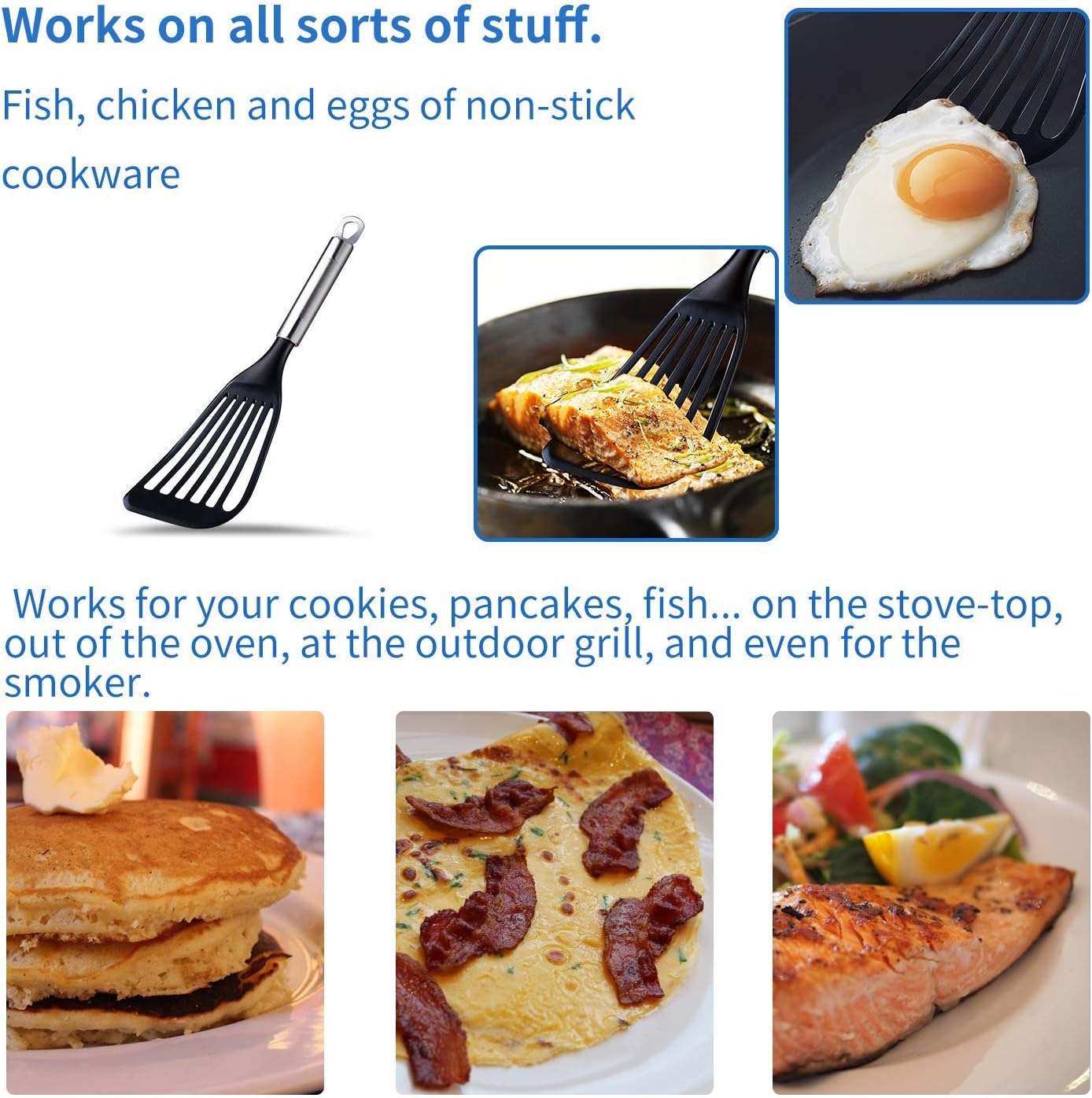 - Our unique angled head design provides better leverage and gets under food more easily than flat spatulas. It offers unparalleled control for flipping pancakes, eggs, and burgers with precision, reducing mess and frustration.