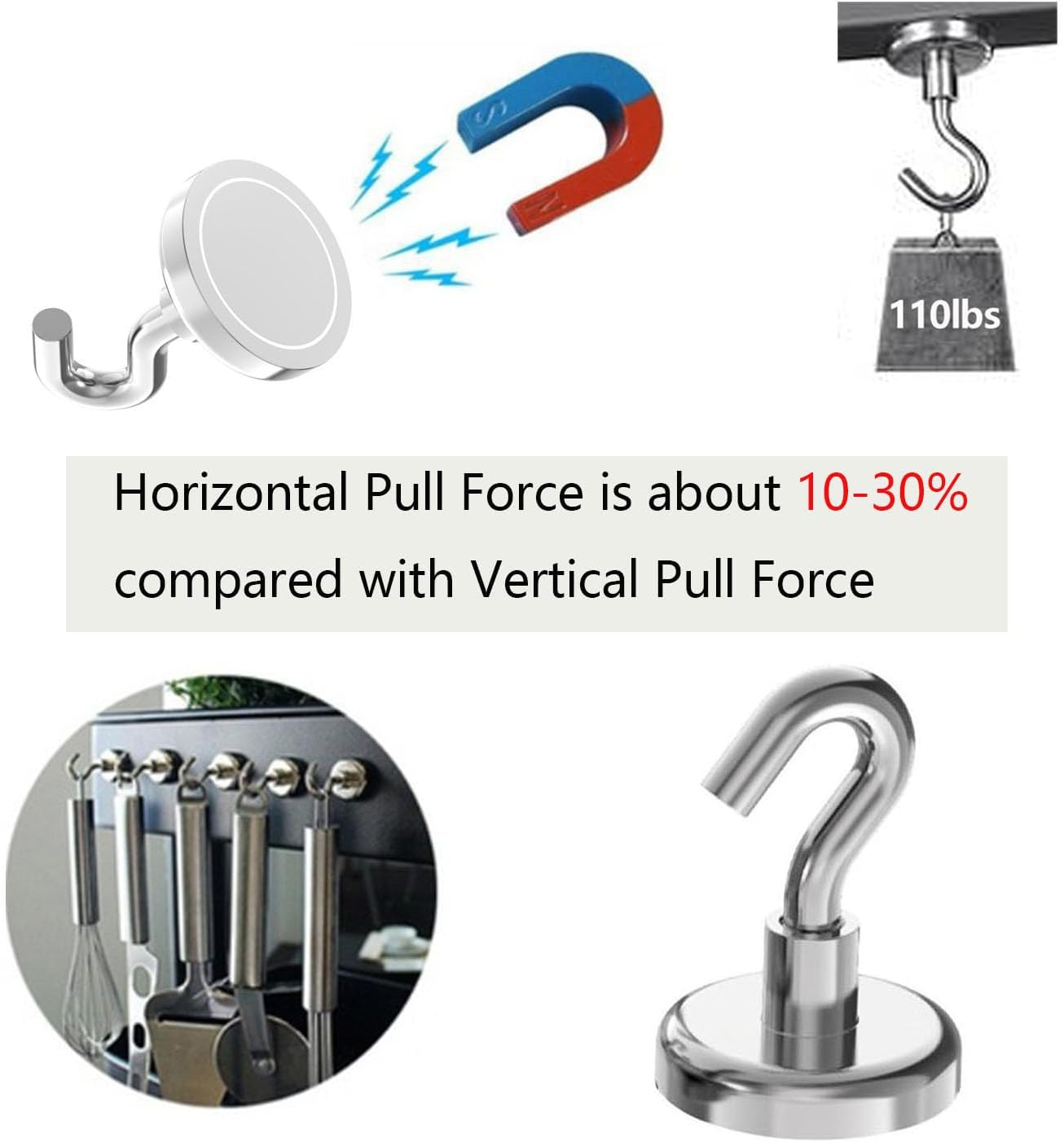 - 【Super Strong】Amazing strong, sturdy, and heavy-duty metal magnetic hook with a steel base, super strong neodymium magnet inside, this magnetic hook offers 110lbs vertical pulling force under thick enough steel plate.The horizontal pulling force is about 10%-30% compared with vertical pulling force based on different thickness of steel plate and metal surface.