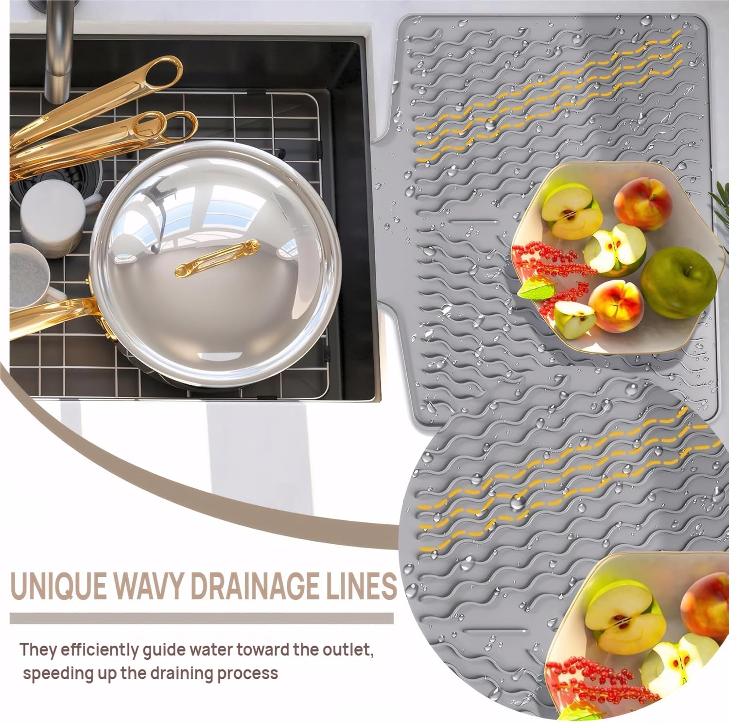 - 💦 Rapid Drainage Design-Engineering with deep wavy channels and a centeral drainage outlet, this dish drainers for kitchen counter accelerates water runoff 50% facster than flat mats. No more soggy sponges or stagnant puddles! The slope design directs liquid instantly towards your sink, keeping your countertops dry and clean, and says goodbye to wet.