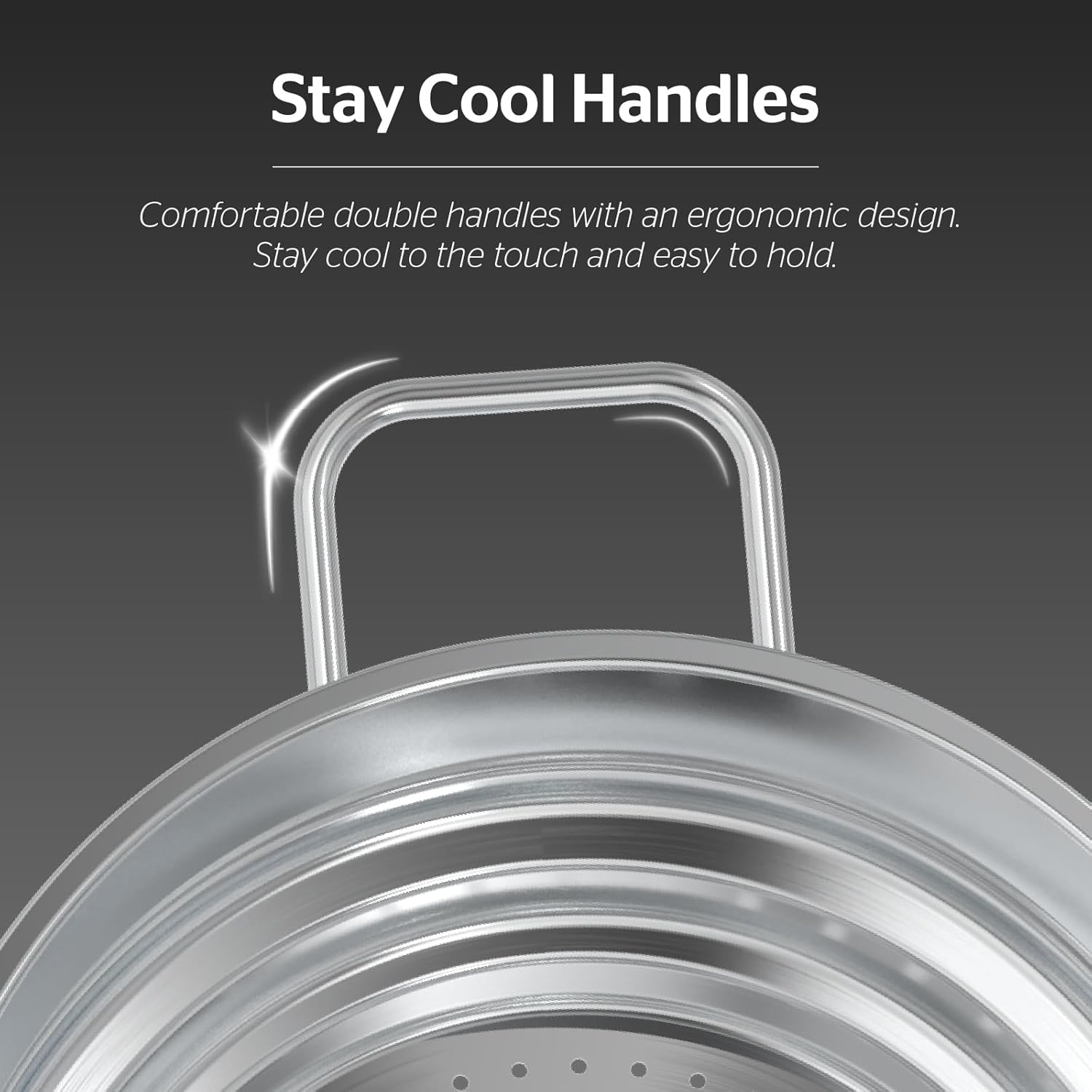 - [Stay-Cool Ergonomic Handles] - Designed with comfortable double handles that remain cool to the touch, making it safe and easy to lift the steamer during cooking.