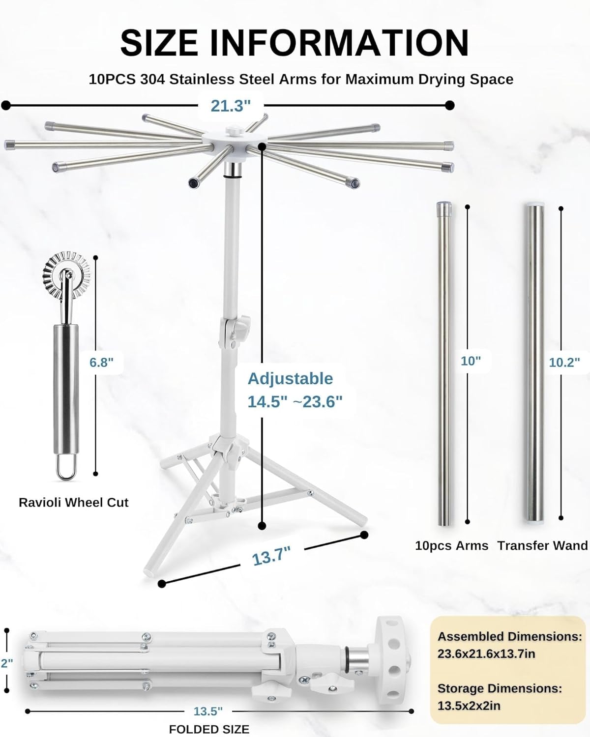 - Included Components : Foldable Pasta Drying Rack, Ravioli Wheel Cut, transfer wand