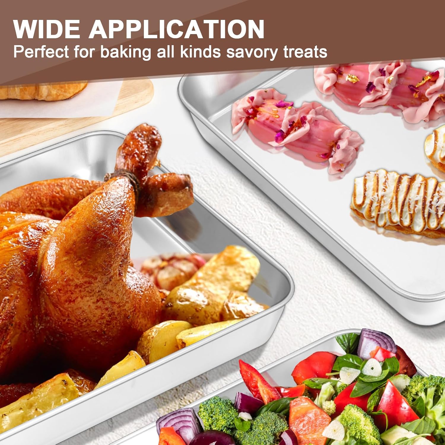 - Versatile Large Baking Pan: This nonstick stainless steel baking pan is designed for commercial and family. The versatile baking pan combo includes 3 different sizes of baking sheets which designed for high performance, 12.2 x 9.5 x 2 inch, 10.2 x 7.9 x 2 inch, and 9.2 x 6.7 x 2 inch. A great replacement of aluminum pans, fits most regular toaster ovens, meet most of your daily baking or roasting needs, also good to be used as serving tray.