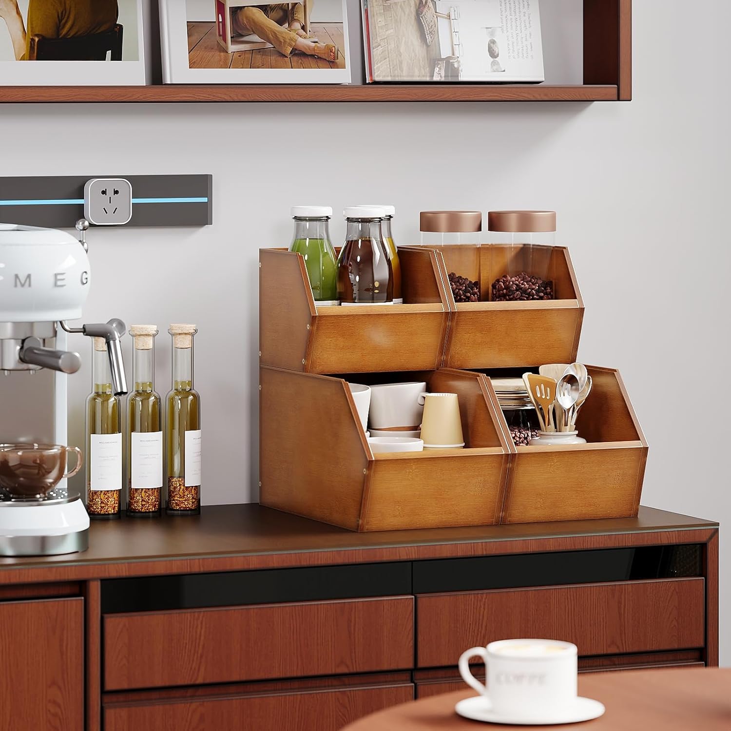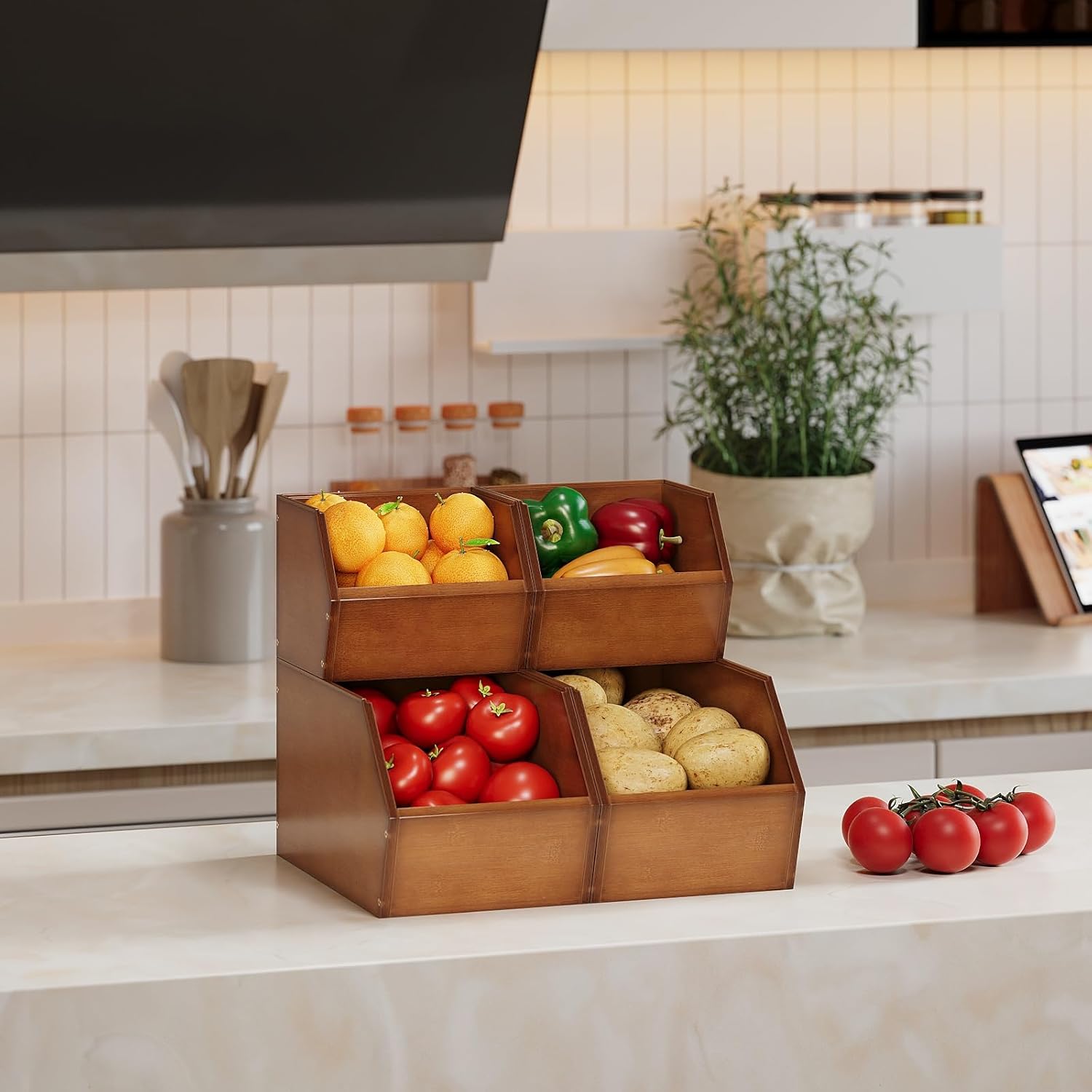 2 Set Bamboo Pantry Storage Bins Wood Stackable Baskets Potato and Onion Storage Bins Fruits Vegetable Bread Organization for Kitchen Counter