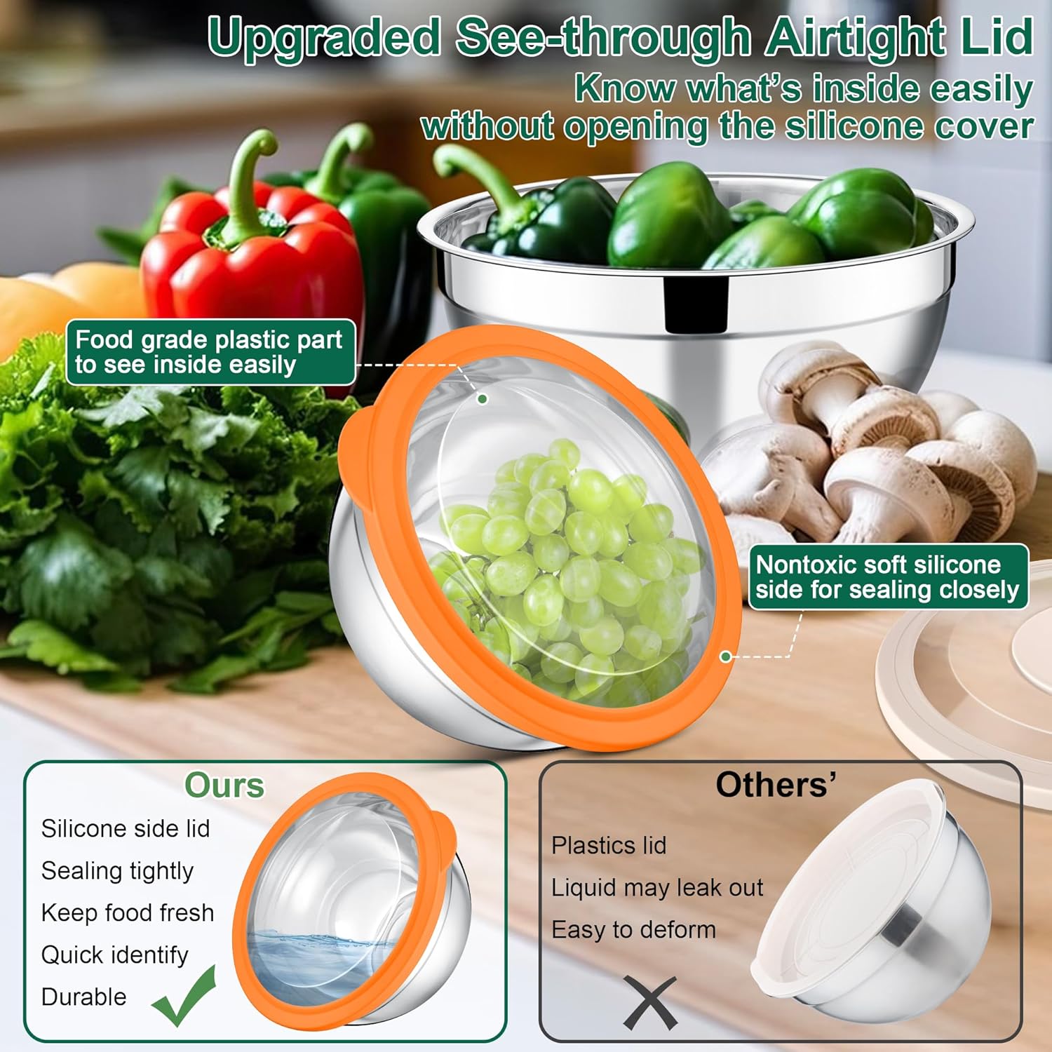 - STACKABLE NESTING SALAD BOWLS: Our mixing bowls with lids set can be stacked and nested together for storage space saving, Keep them in your cabinet or on the countertop in order, Take all metal bowls and transparent lids out at one time when you need them, Saving time for meal preparing, Make your kitchen tidy and organized, Dishwasher safe(Exclude the lids) can free your hands, Saving time and effortless in cleaning