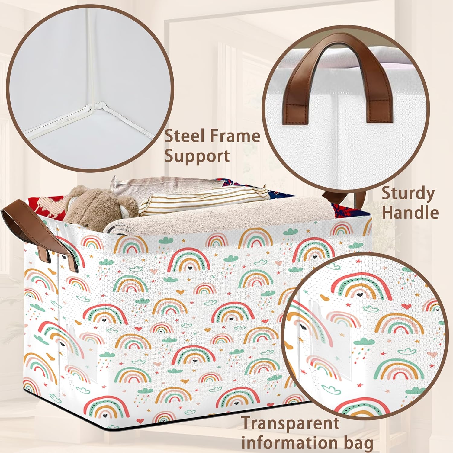 - Conveniently Within Reach: Mogifedc Boho Rainbow Basket Comes With Leather Handles For Easy Transport. Each Handle Is Reinforced And Secured To The Basket With Extra-Strong Stitching,So The Basket Can Withstand Heavy Loads. Each Of These Soft Handles Ensures a Comfortable Grip,Making Housework a Breeze.