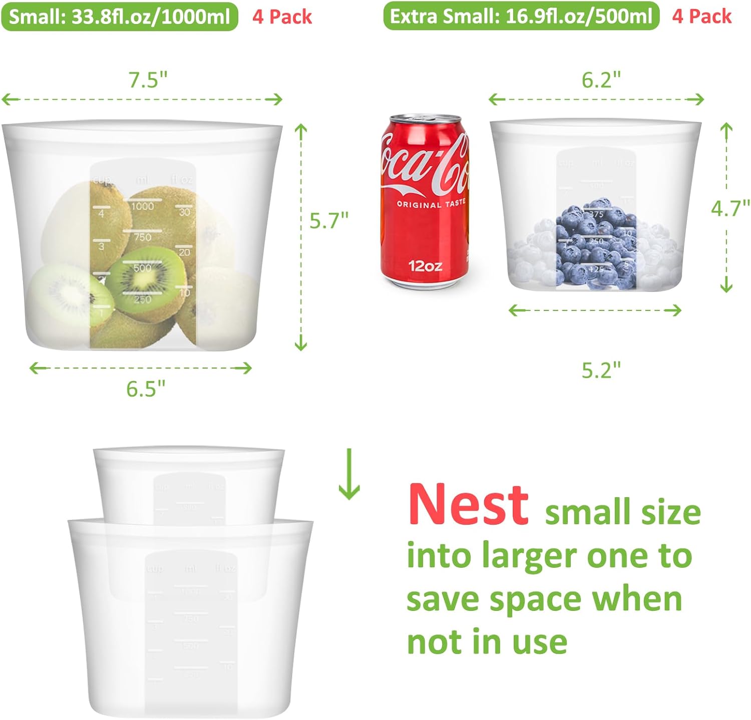 - 【THOUGHTFUL & ECONOMICAL】You'll receive 4 Small size 33.8fl.oz/4cup/1000ml(Quart size for sandwich) and 4 Extra Small snack size 16.9fl.oz/2cup/500ml in translucent color. Reusable silicone food storage bags come with clearly volume marks in cups, milliliters and fluid ounces for easy use. Translucent body easy to see what's inside, though not in crystal clear. Plus, one silicone bag can reduce up to 300+ single-use plastic bags a year, helping to create a waste-free world