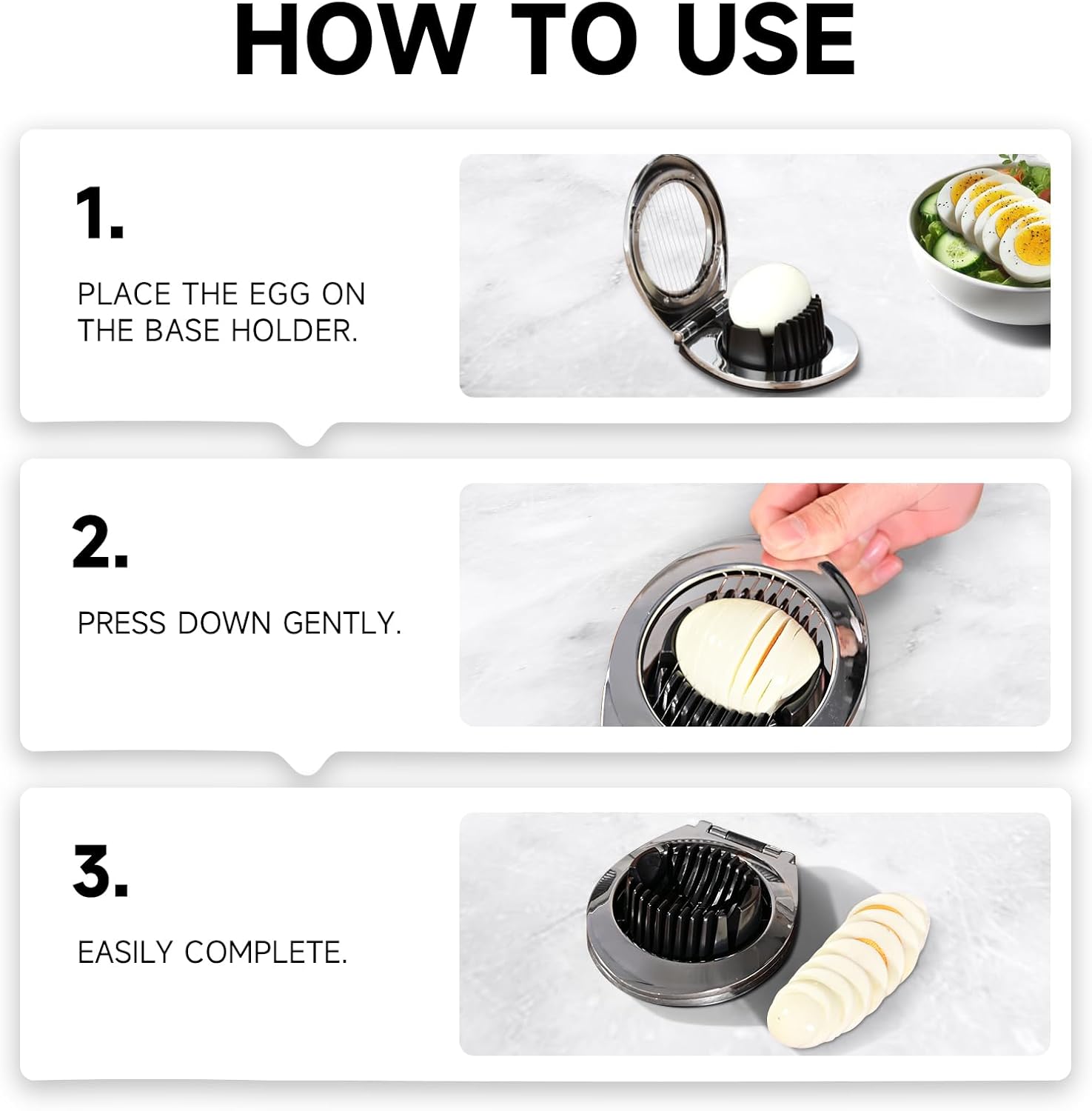 - Simple One-Press Operation:Simply place your egg or fruit into the slicer, press the handle, and get perfectly even slices in seconds. No complicated steps—ideal for both beginners and experienced home cooks