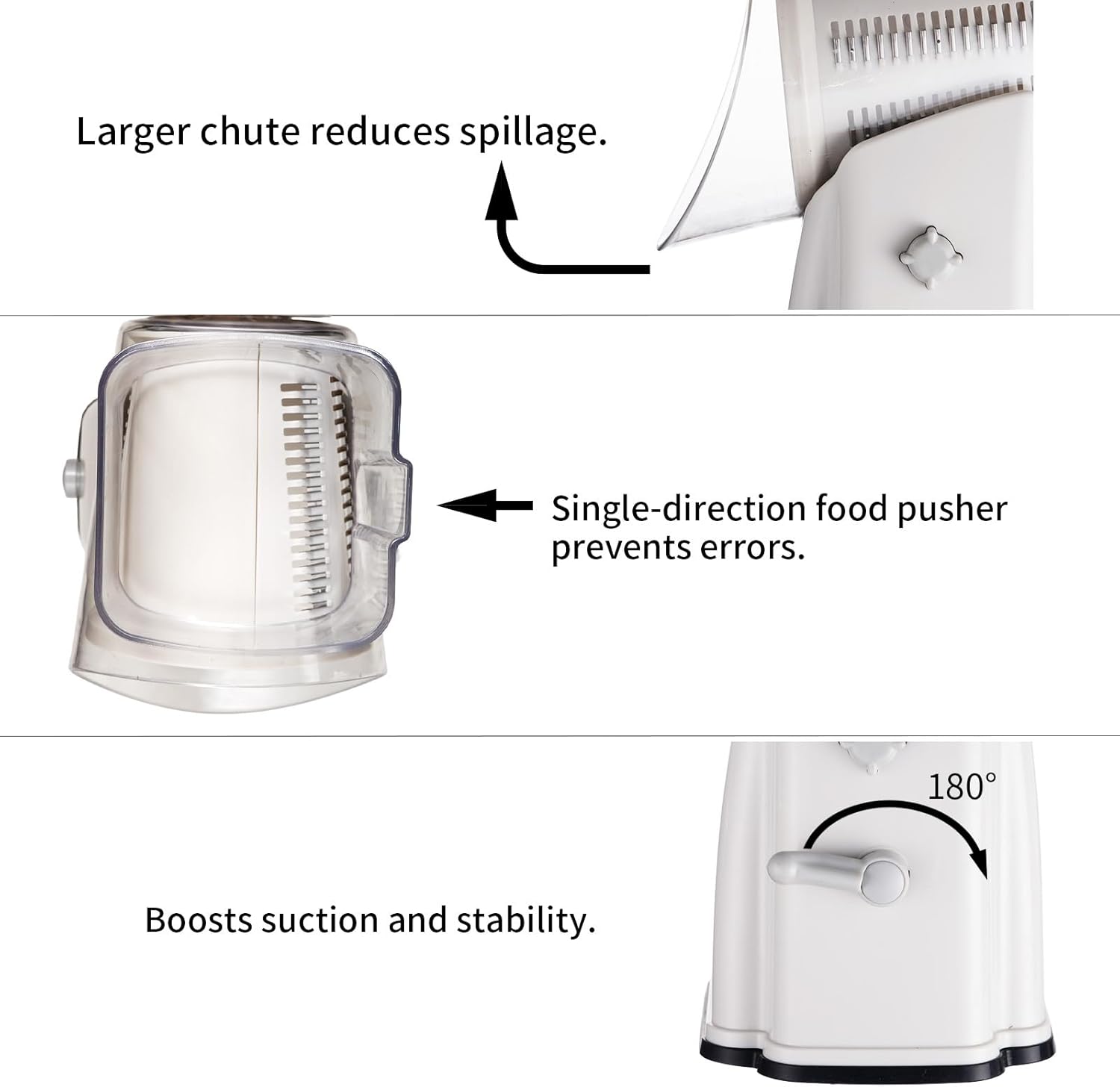 - โ Important Tipsโ : Compared with the grater currently on the market, we have made three improvements and upgrades, namely: 1. 180ยฐ Rotation boosts suction and stability. 2.Larger chute reduces spillage. 3.Single-direction food pusher prevents errors.