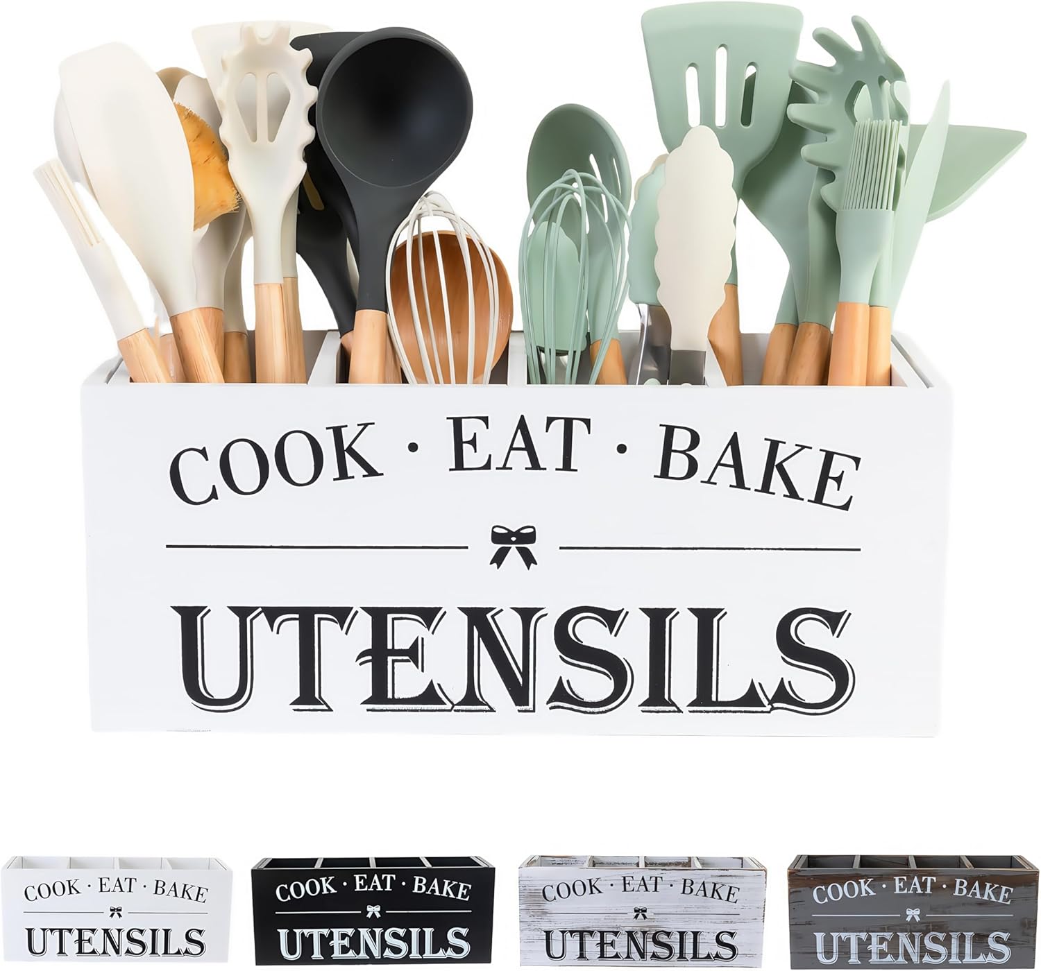 Utensil Holder,Extra Large Wooden Utensil Holder For Kitchen Counter,Cooking Spatula Organizer,Big Storage Caddy With 4 Compartments Flatware Spoon Tool Cutlery(White)