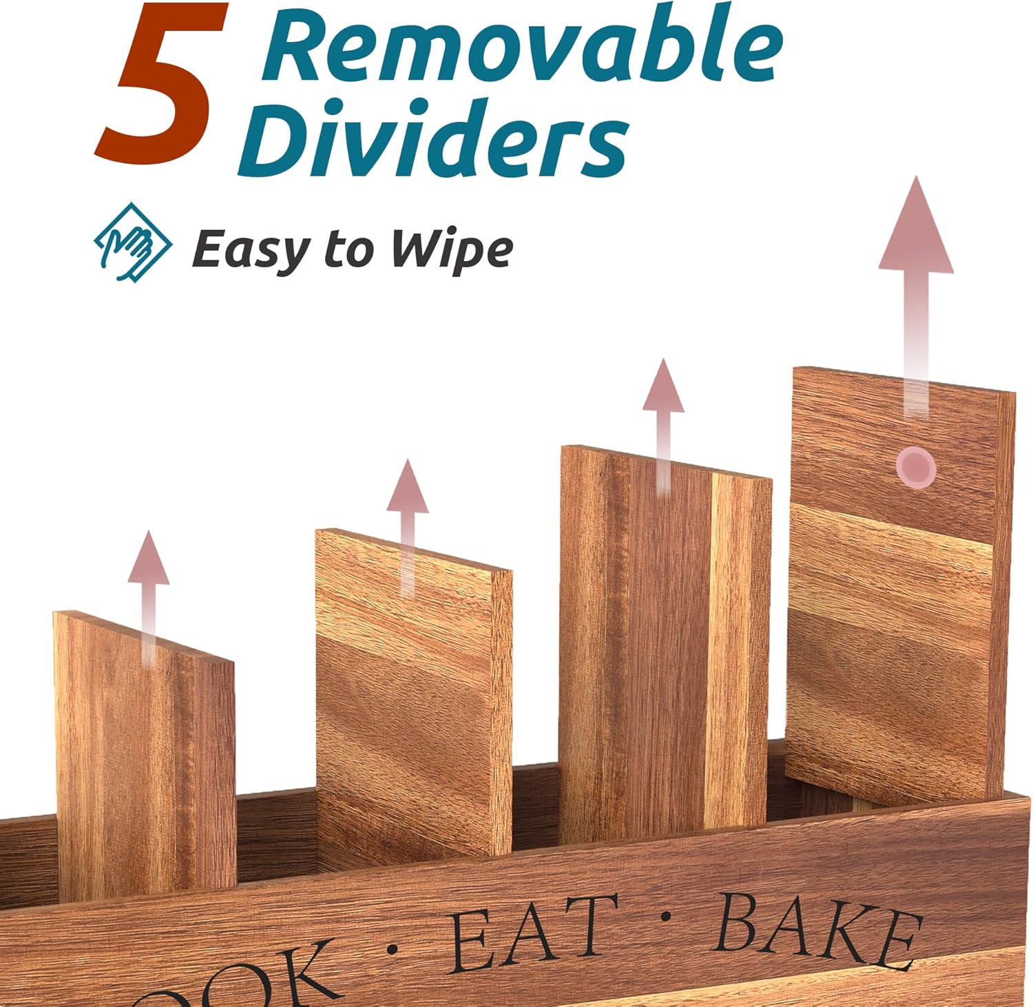 - UPGRADE DIVIDER DESIGN - Our acacia wooden utensil organizer has 4 compartments. Large, roomy and pretty. Easy to grab utensils. Size:15.74"L x 5.9"W x 7.08"H. You can store all of your cooking tools easily and neatly. The rectangular shape can fit in nicely against the wall. A nice kitchen decoration!