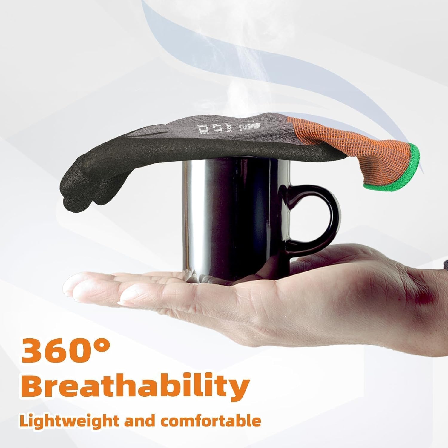 - ROCK-SOLID WEAR RESISTANCE - Advanced nitrile work gloves with sandy coating deliver rock-solid abrasion resistance, last three times as long as other coated working gloves, Ideal for high-wear scenarios like mechanic gloves and construction gloves ; These protective gloves are tested to Level 4 abrasion standards, ensuring long-term durability and reliability.