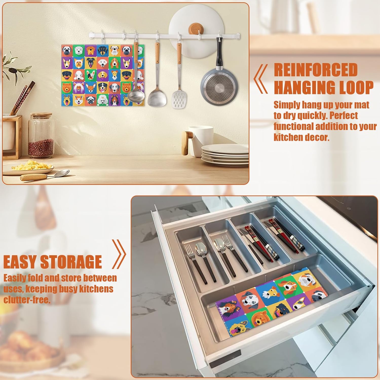 - 【Easy to Clean】The utensil drying mat can be cleaned by hand or machine to remove stains, the kitchen utensil drying mat to dry quickly without a machine. HD printed suede has excellent color lock, does not fade and can be reused many times.