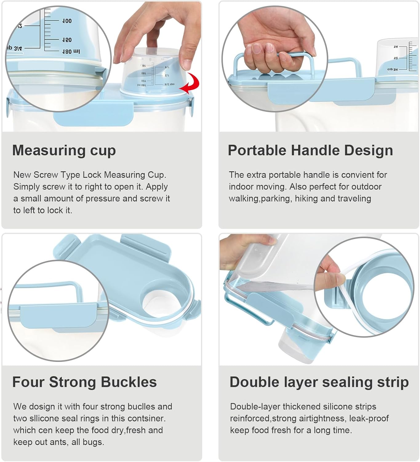 - LARGE CAPACITY:Portable rice airtight storage container capacity of 5 liters, which is very suitable for beans,Cereal,flour, sugar, oatmeal, coffee, rice, nuts, snacks, dog food, cat food, pet food, etc. (Note: The storage capacity of the container varies depending on the size of the food. Pet food can hold 5 pounds, and rice food can hold 5-10 pounds)
