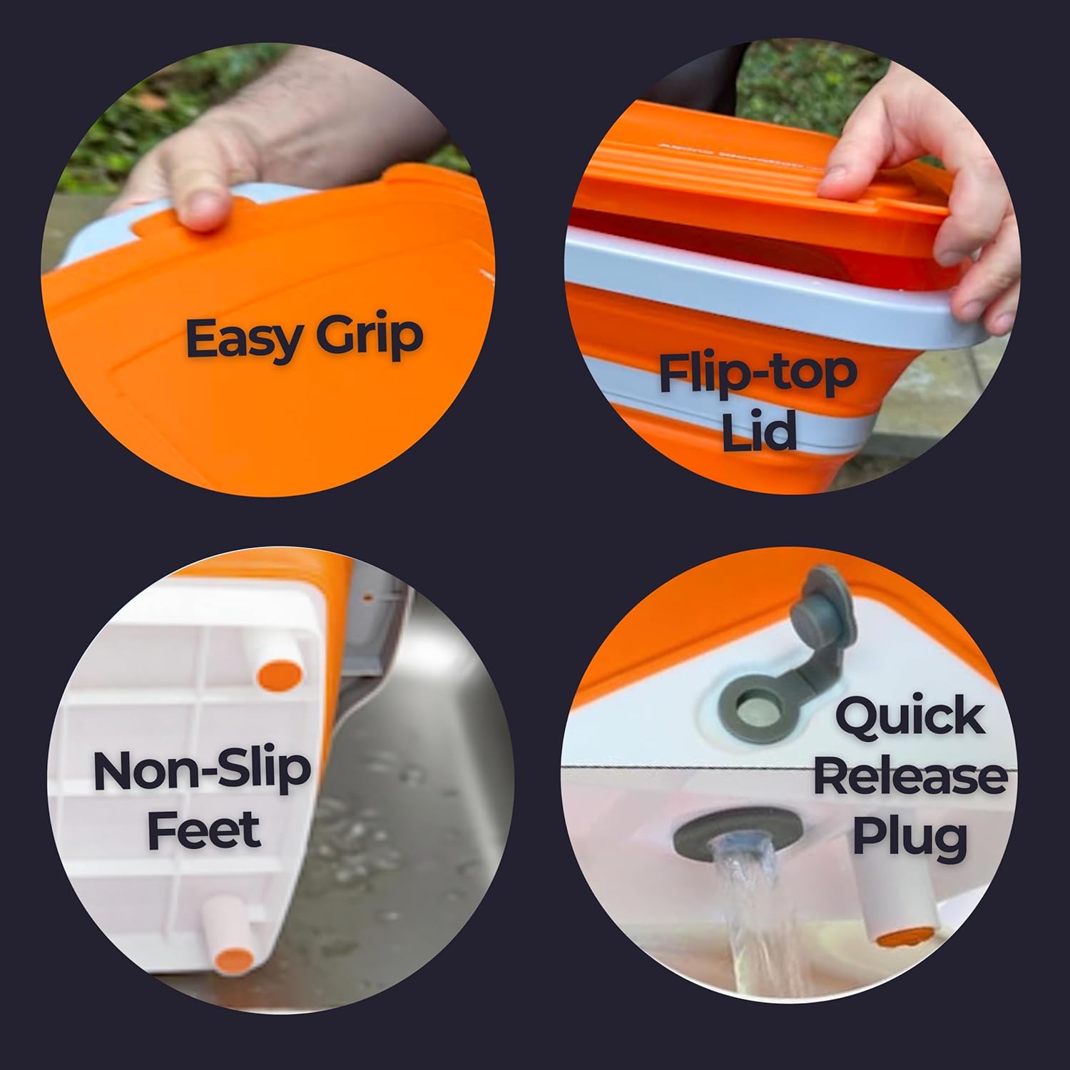 Collapsible Large (8L) BBQ Marinating Tub w/Cutting Board | Multipurpose Food-Grade TPE Prep Tub w/Lid | Built-in Colander & Drain Plug - for Camping | Tailgate | Picnic - Bold Orange