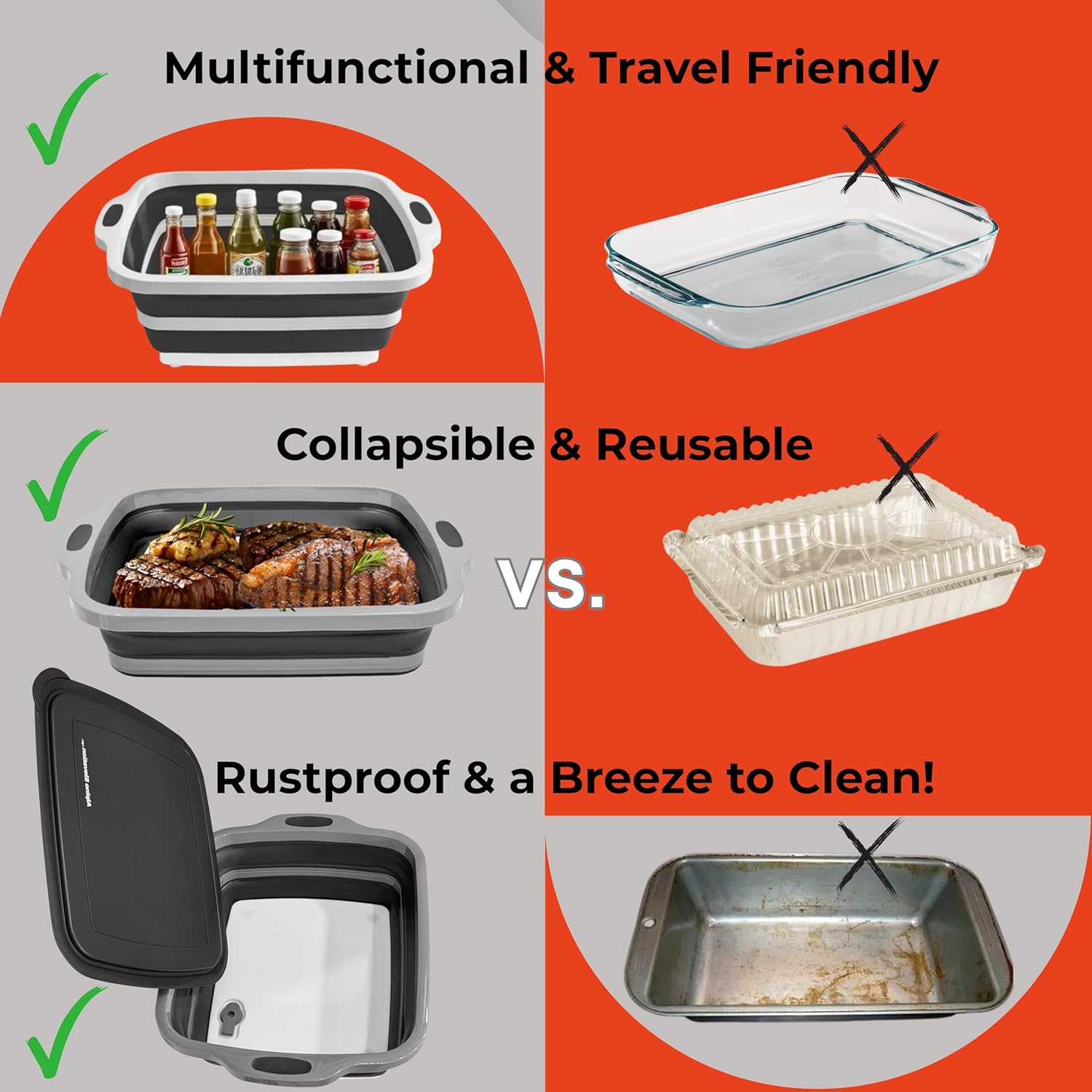 - 3-in-1 BBQ Prep Tub + Lid – Transforms into a wash basin, marinade tub, or light-duty cutting board. Fully collapsed form doubles as a serving tray.