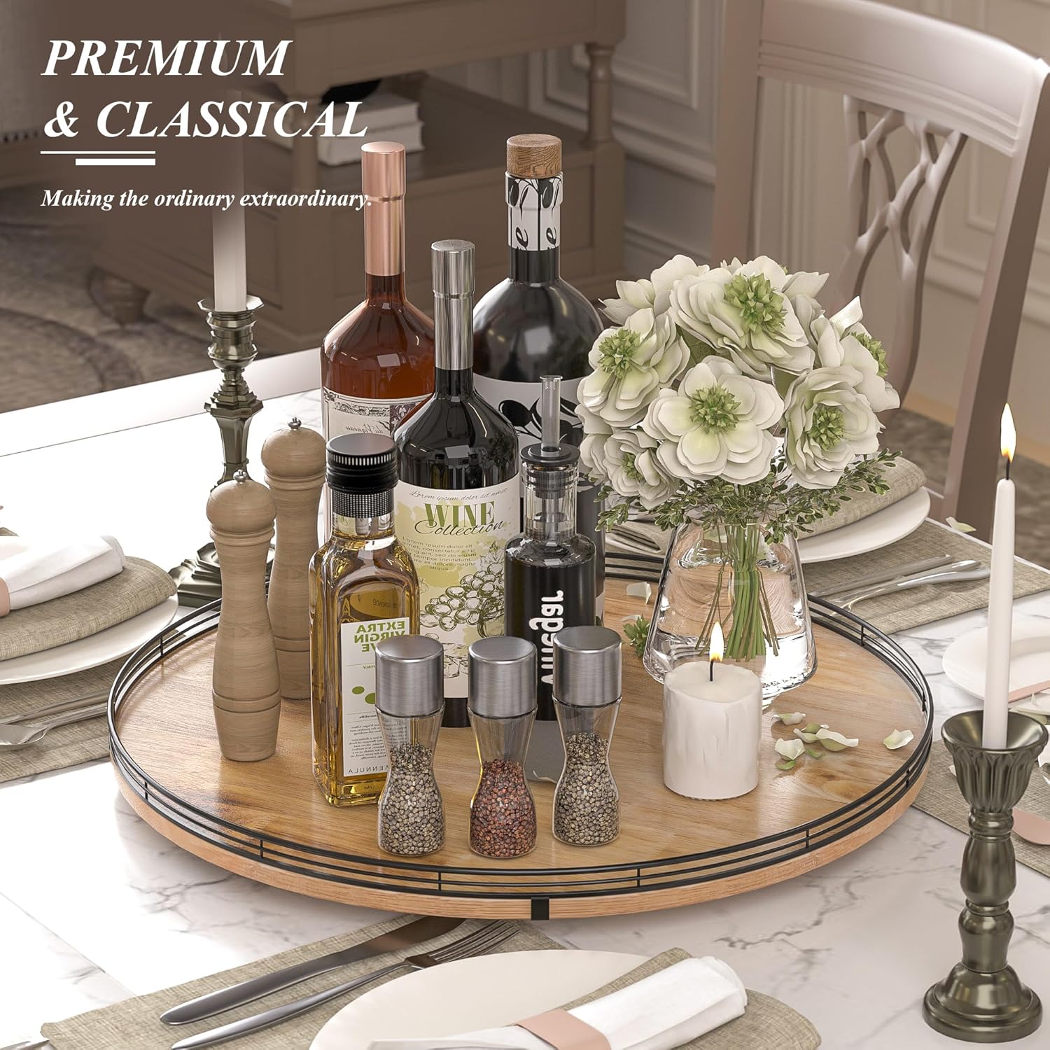 - PREMIUM MATERIAL: Our farmhouse lazy Susan organizer is made of natural solid oak wood and strong metal, sturdy, durable and premium quality. This wooden turntable organizer is a game-changer for keeping your kitchen organized. The farmhouse oak finish gives it a rustic, charming look that will fit perfectly with your kitchen decor.
