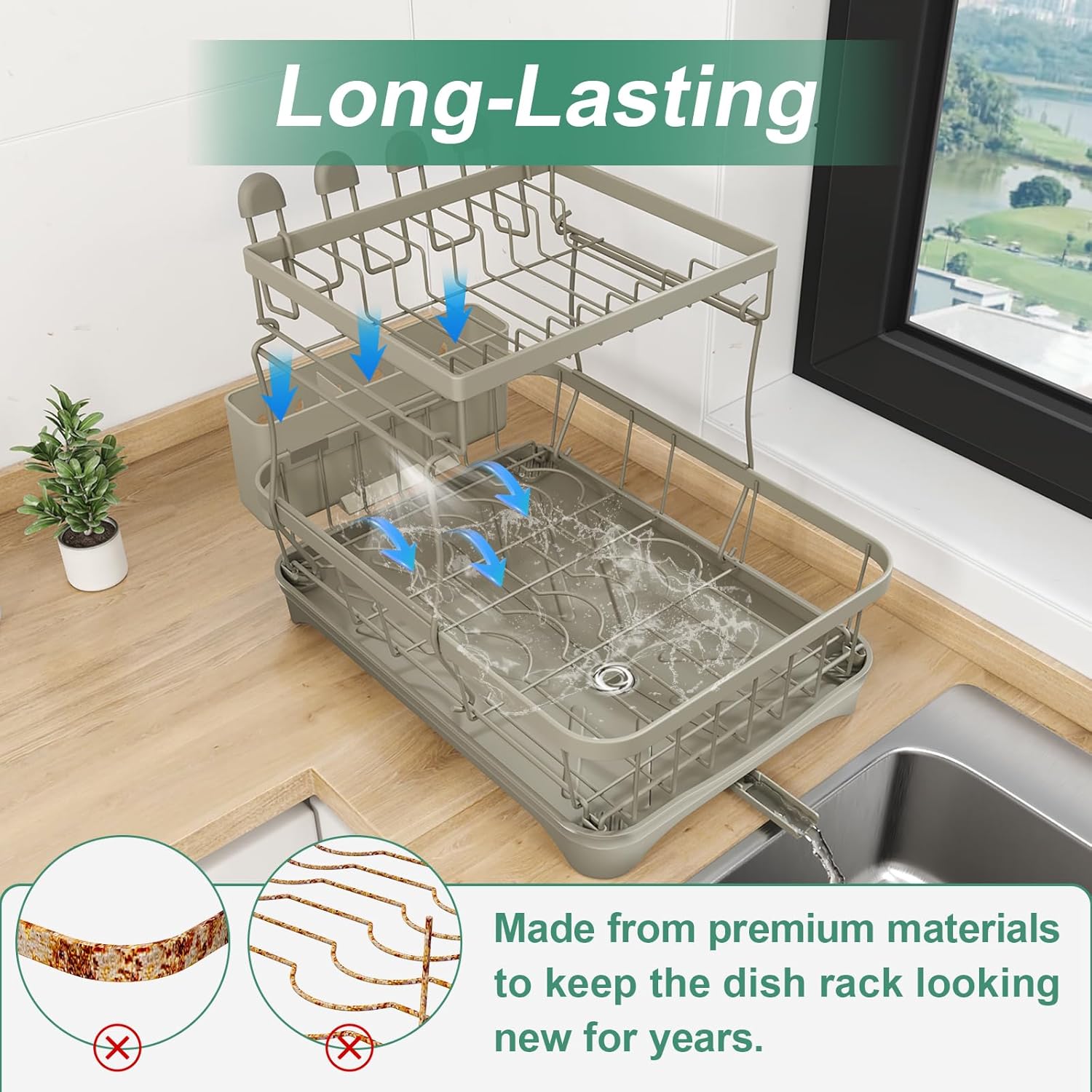 Dish Drying Rack, 2-Tier Dish Drying Rack with Utensil Holder – Large Capacity Auto-Draining Dish Drainer with Drainboard for Kitchen Counter, Grey