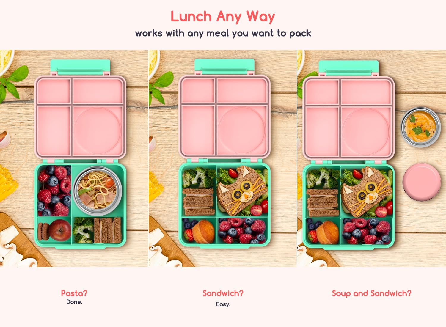 - 100% Leak-Proof: Our lunch box lid uses a silicone seal to seamlessly fit the edges of each compartment, so that no odors can mix or transfer between compartments. Hot soup/cold drinks can be stored separately in the thermos, and say goodbye to the messy backpack caused by spilled food.