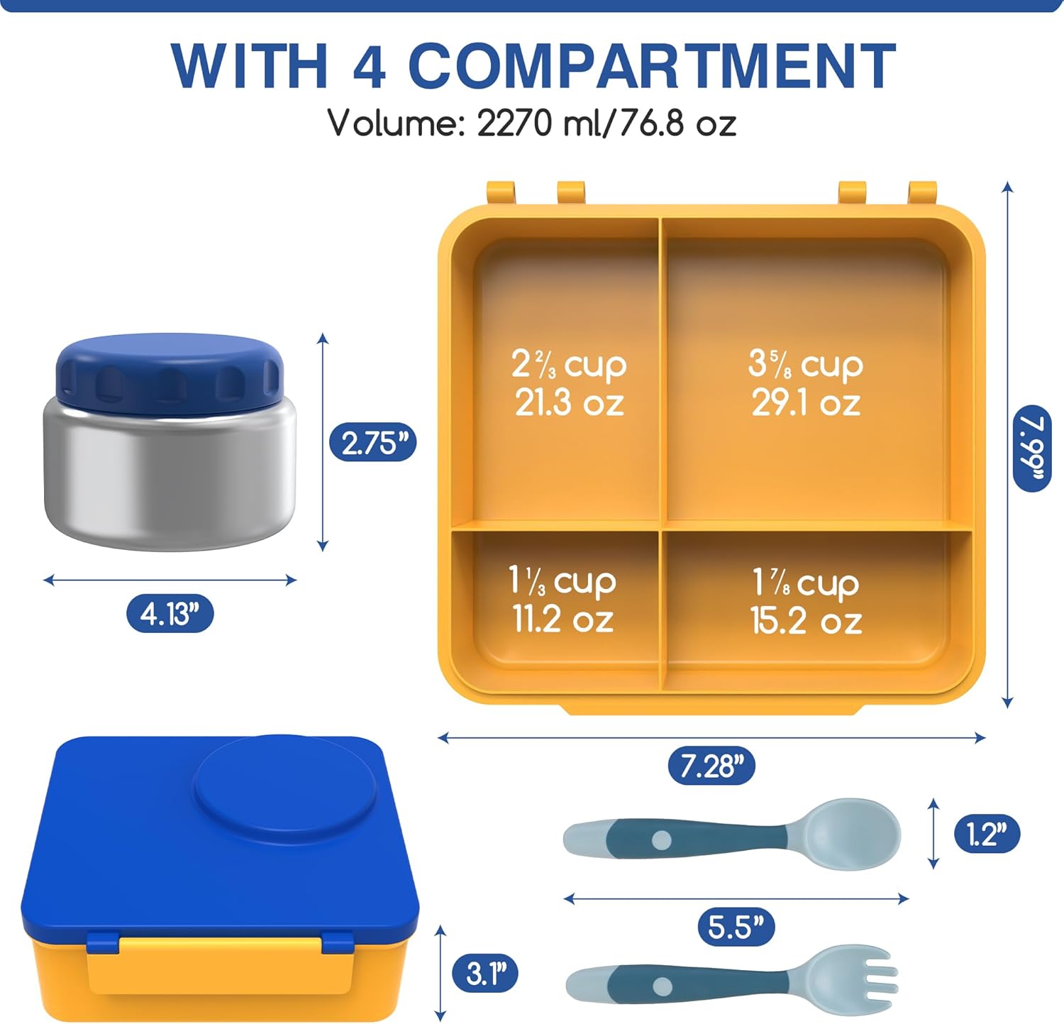 Bento Box for Kids - Leak-Proof Lunch Box with Insulated Thermos Food Jar - 4 Compartments, 1 Removable Divider, 1Spoon, 1 Fork - Dishwasher Safe, BPA-Free (Blue)