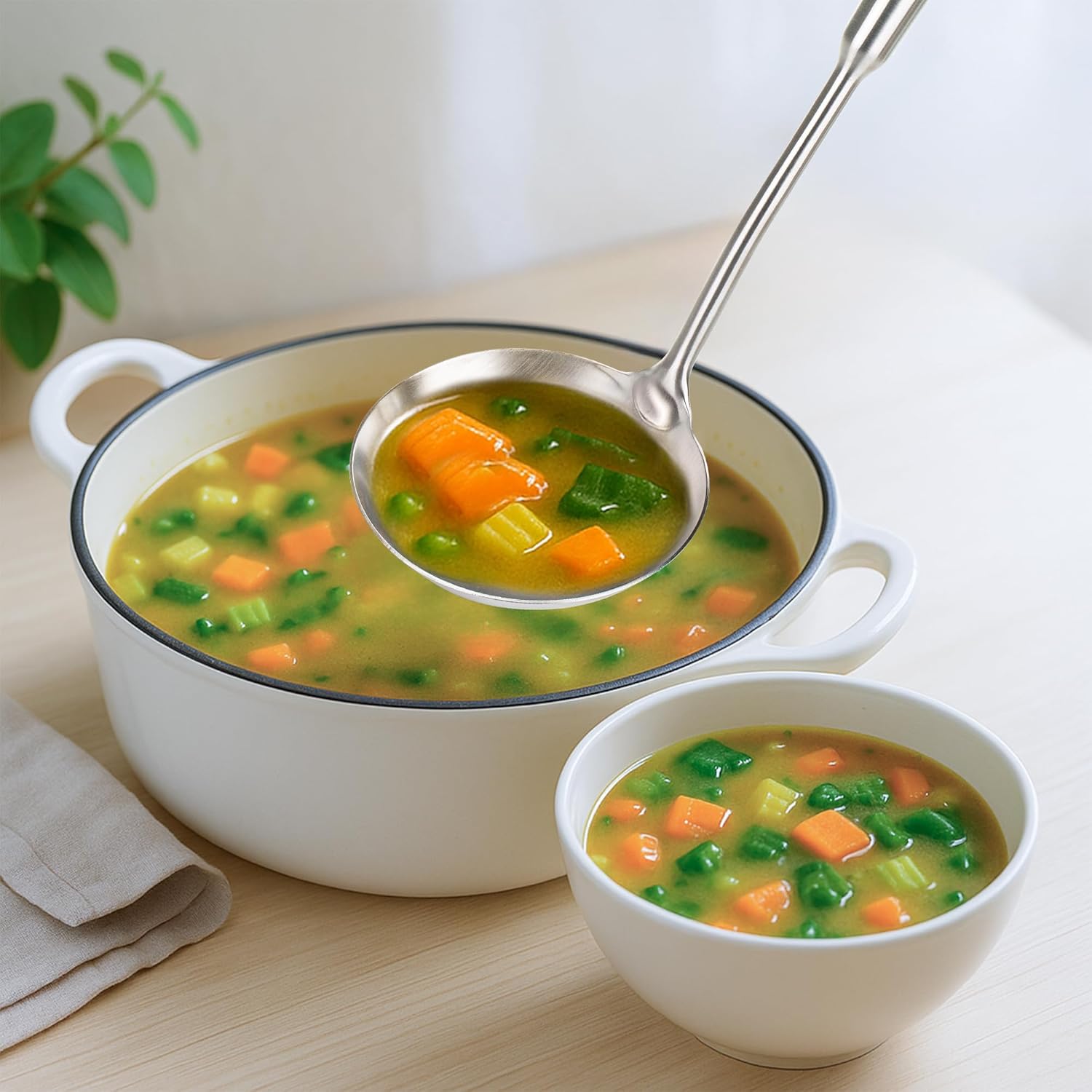 - Premium Wok Ladle : Crafted from high-quality, food-grade 18/8 stainless steel, this soup ladle resists rust, corrosion, and stains, ensuring long-lasting durability for daily use in soups, sauces, or batters.