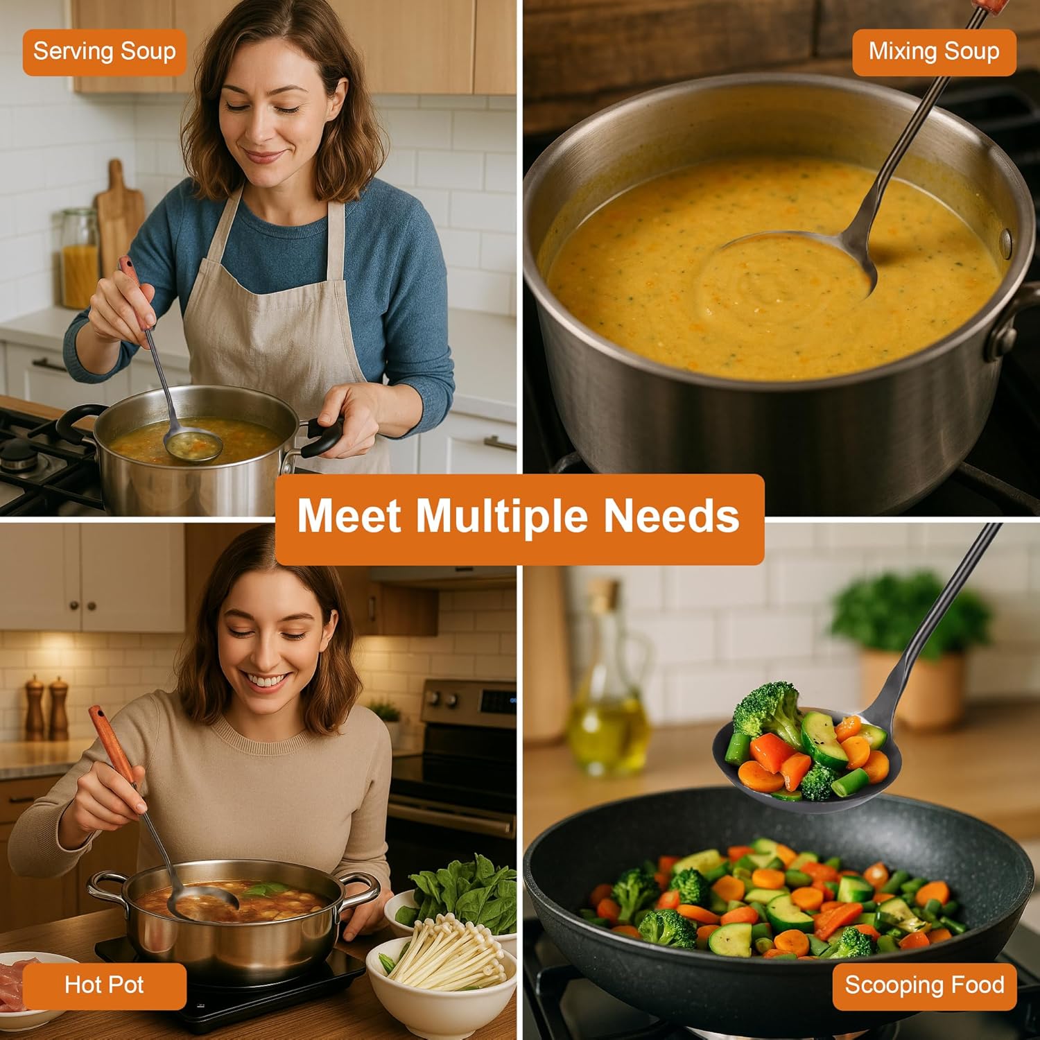 - Premium Wok Ladle : Crafted from high-quality, food-grade 18/8 stainless steel, this soup ladle resists rust, corrosion, and stains, ensuring long-lasting durability for daily use in soups, sauces, or batters.