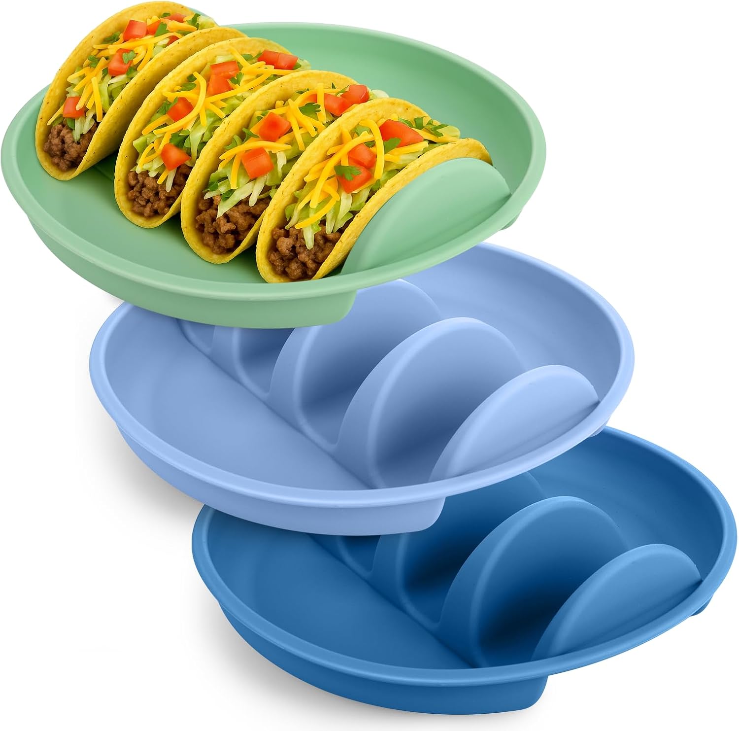 Silicone Taco Holder Plates Set of 3 - Reusable Taco Stand Plates with 4-Shell Slots, Oven/Microwave/Dishwasher Safe, Non-Slip Base for Tortillas Party Serving, Family Dinner & Meal Prep Accessories