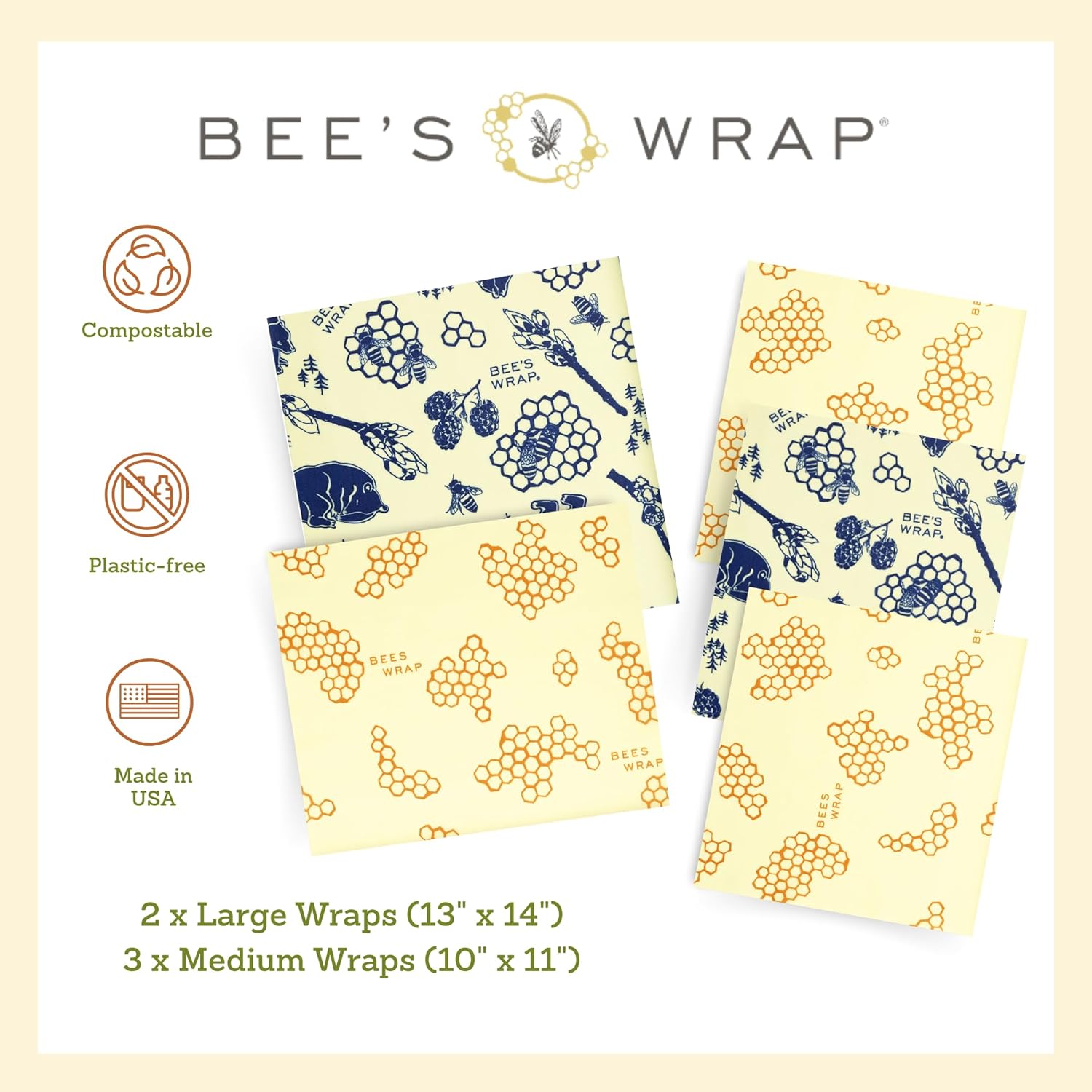 Bee's Wrap Beeswax Wraps for Food - Honeycomb & Bees + Bears Assorted 5 Pack (2L, 3M) Made in USA Reusable & Organic Food Wraps & Bowl Covers - Eco-Friendly Alternative to Aluminum Foil & Plastic Wrap
